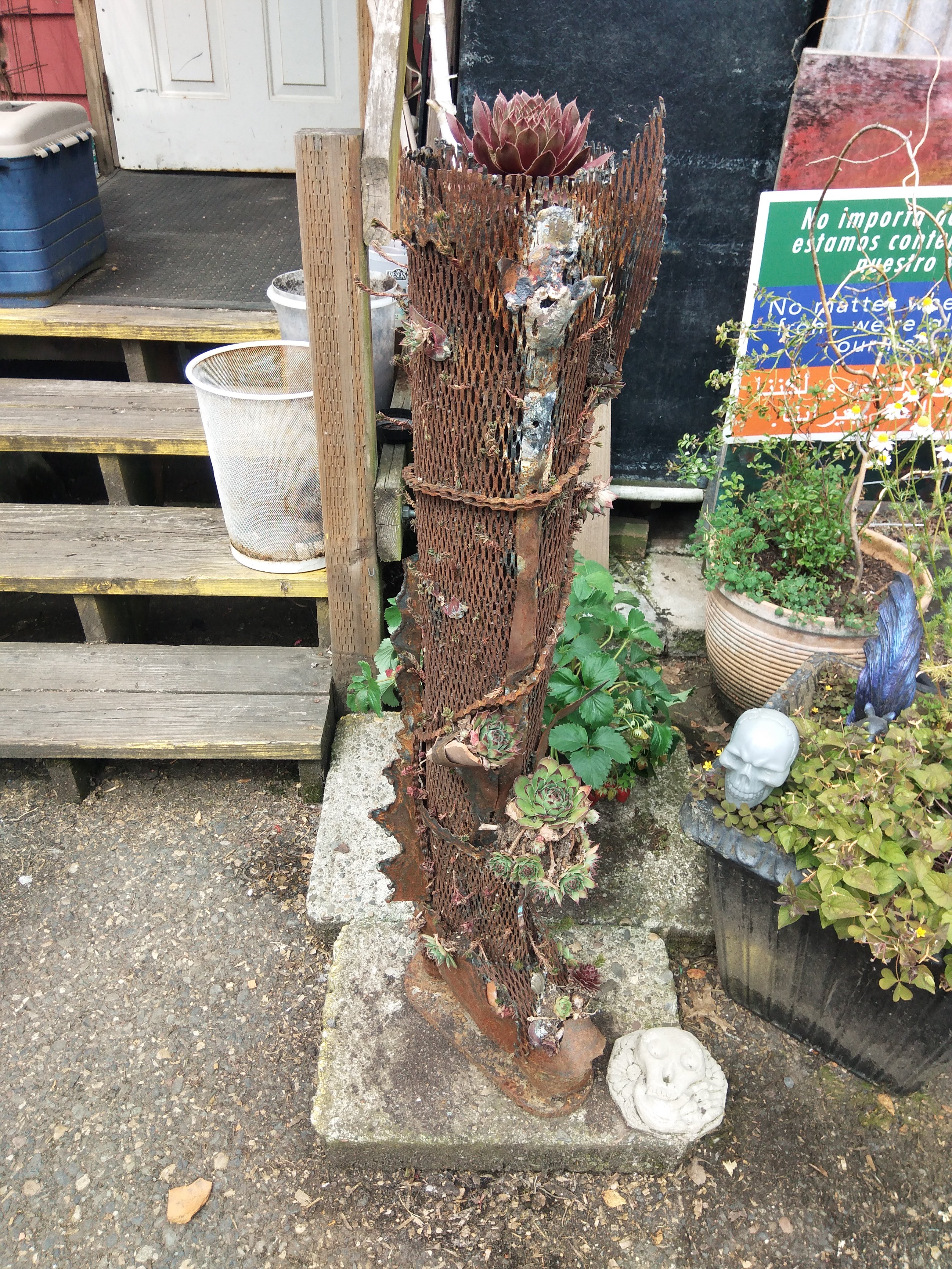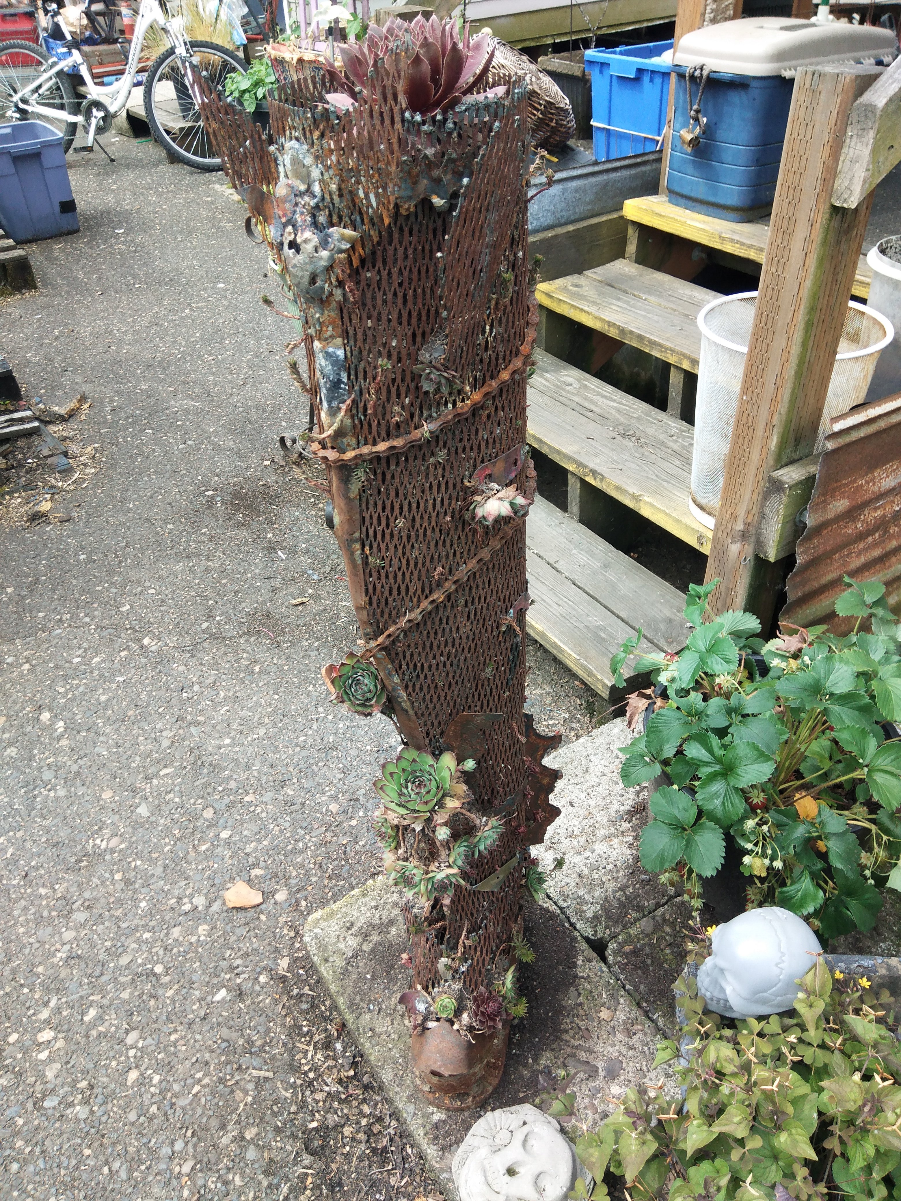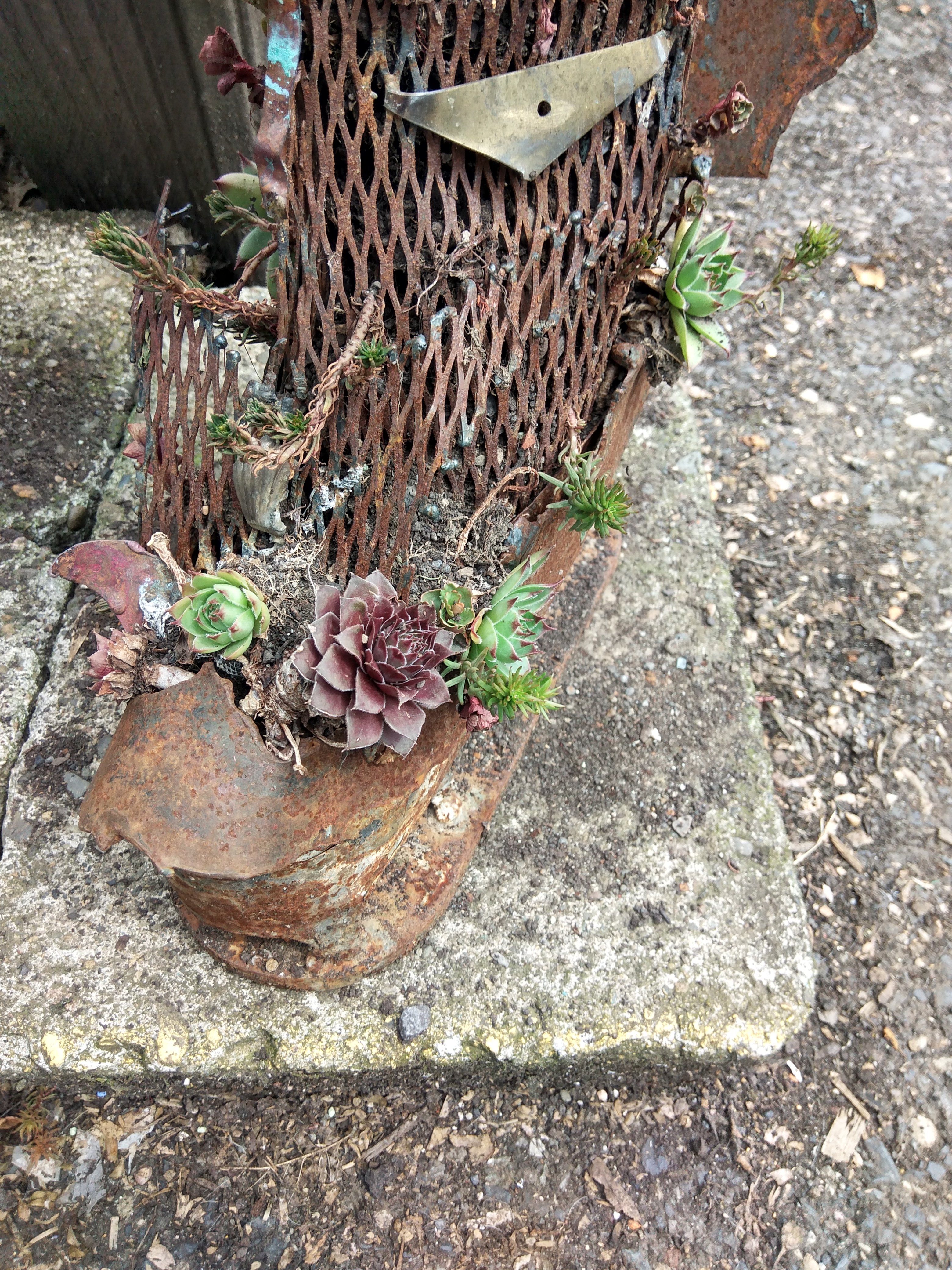 Sauron’s party boot is for sale now, I feel safe enough moving it around, the succulents have taken root and seemed to have nestled in, the sculpture is approximately 3 feet tall steel mesh and planted with 3 or 4 there’s of succulents. I’m asking $200.00 for Sauron’s party boot, half of which will go to support Dignity Village store and general fund, and will need to be picked up upon purchase.