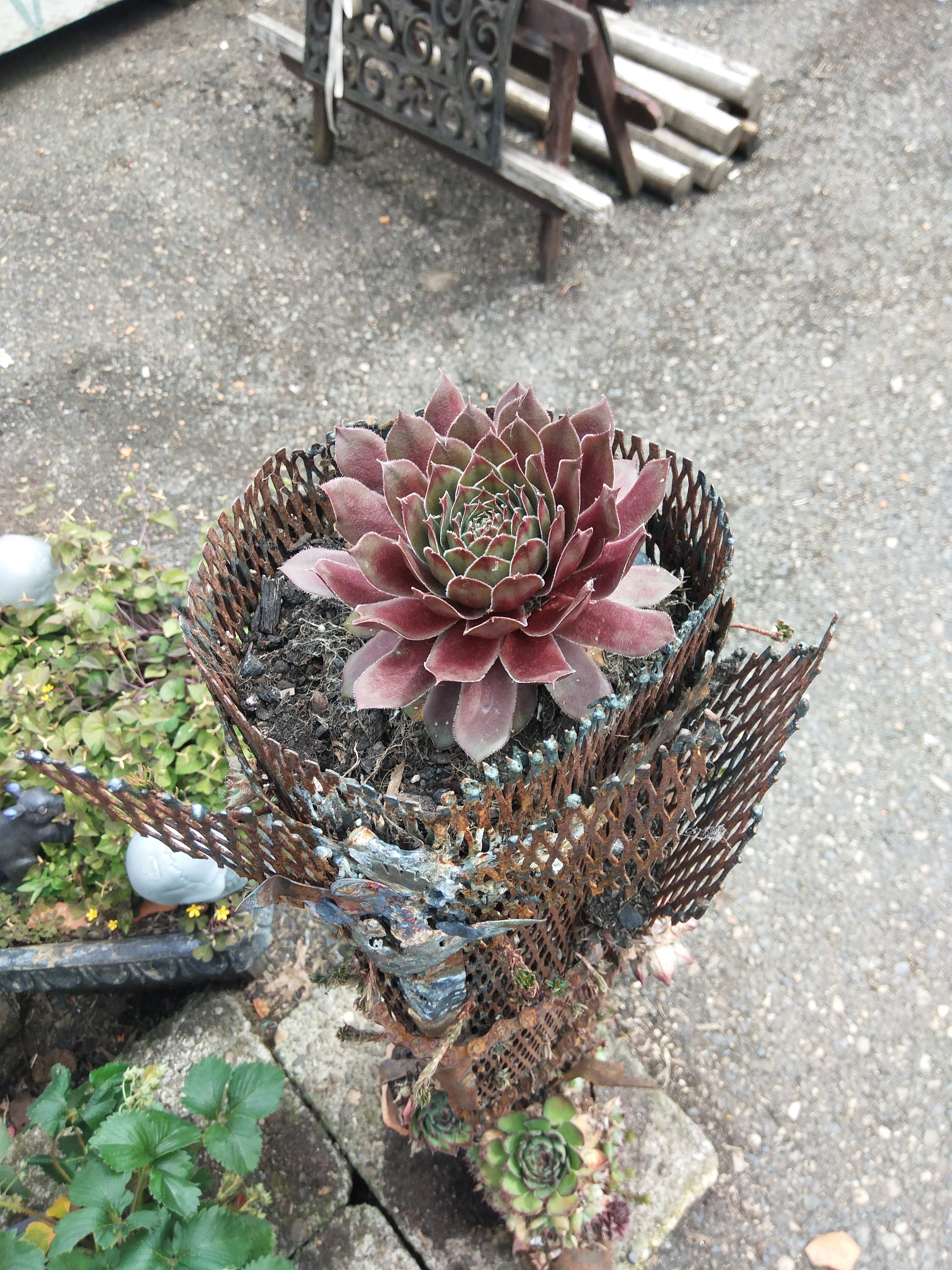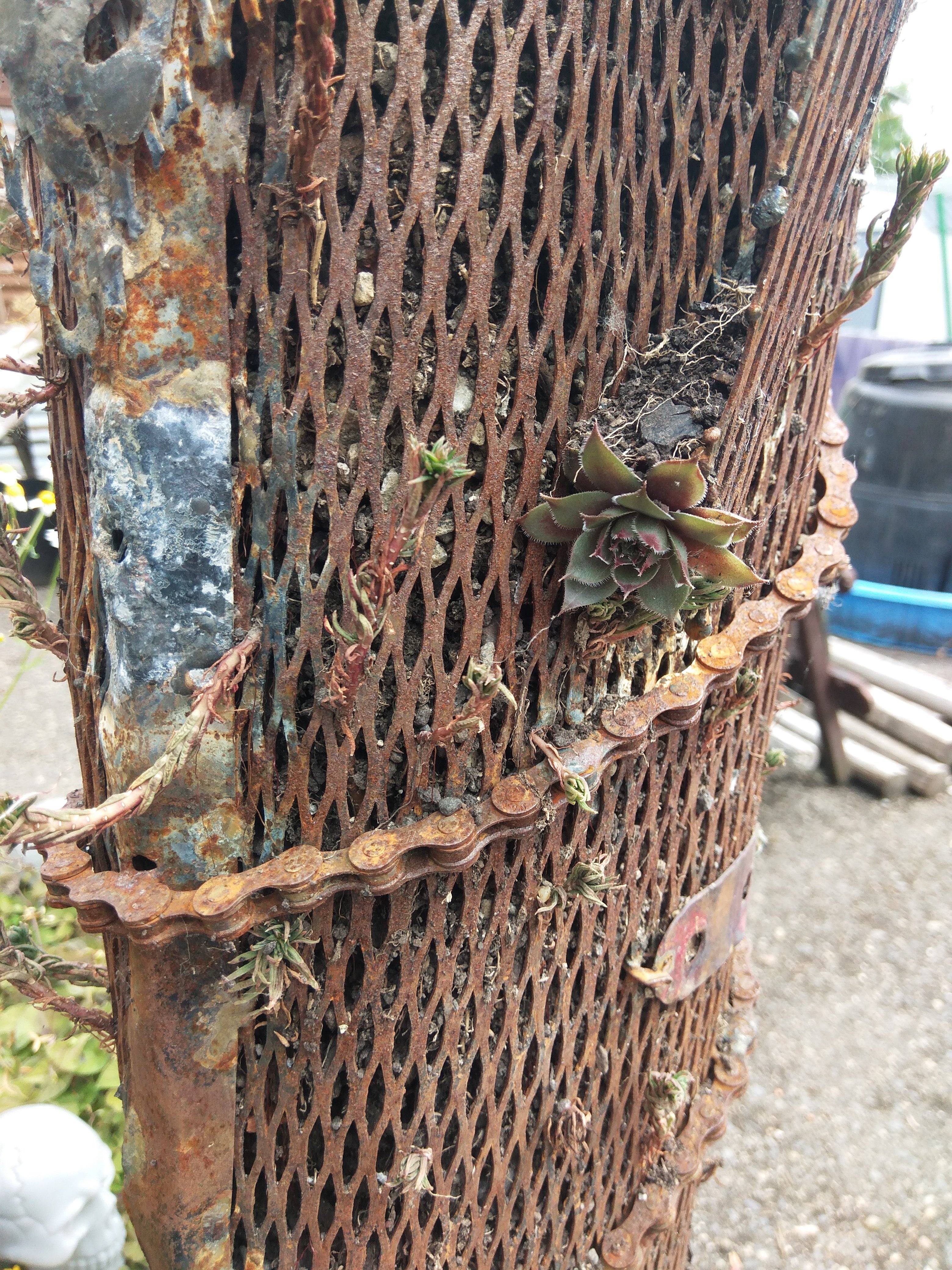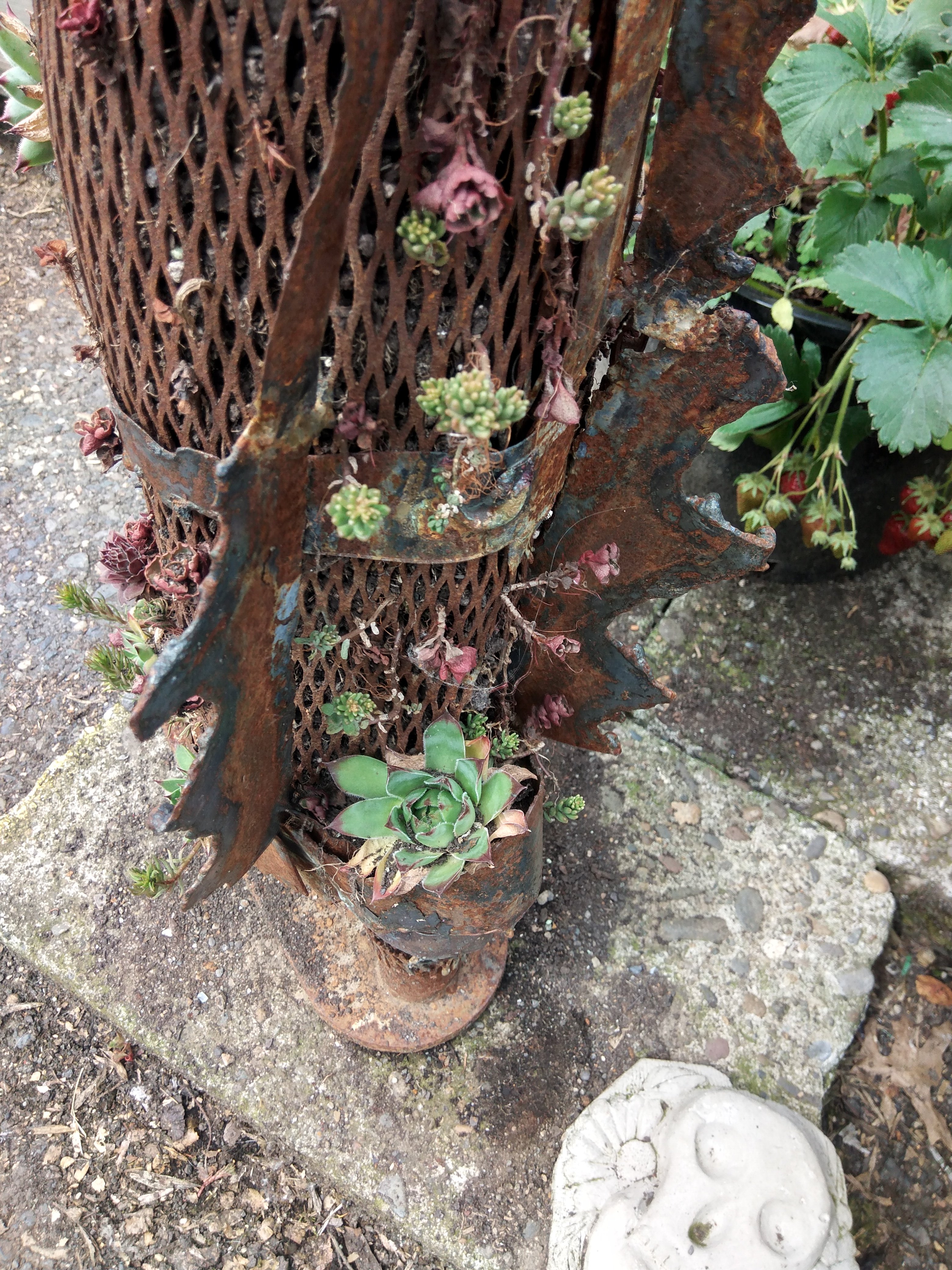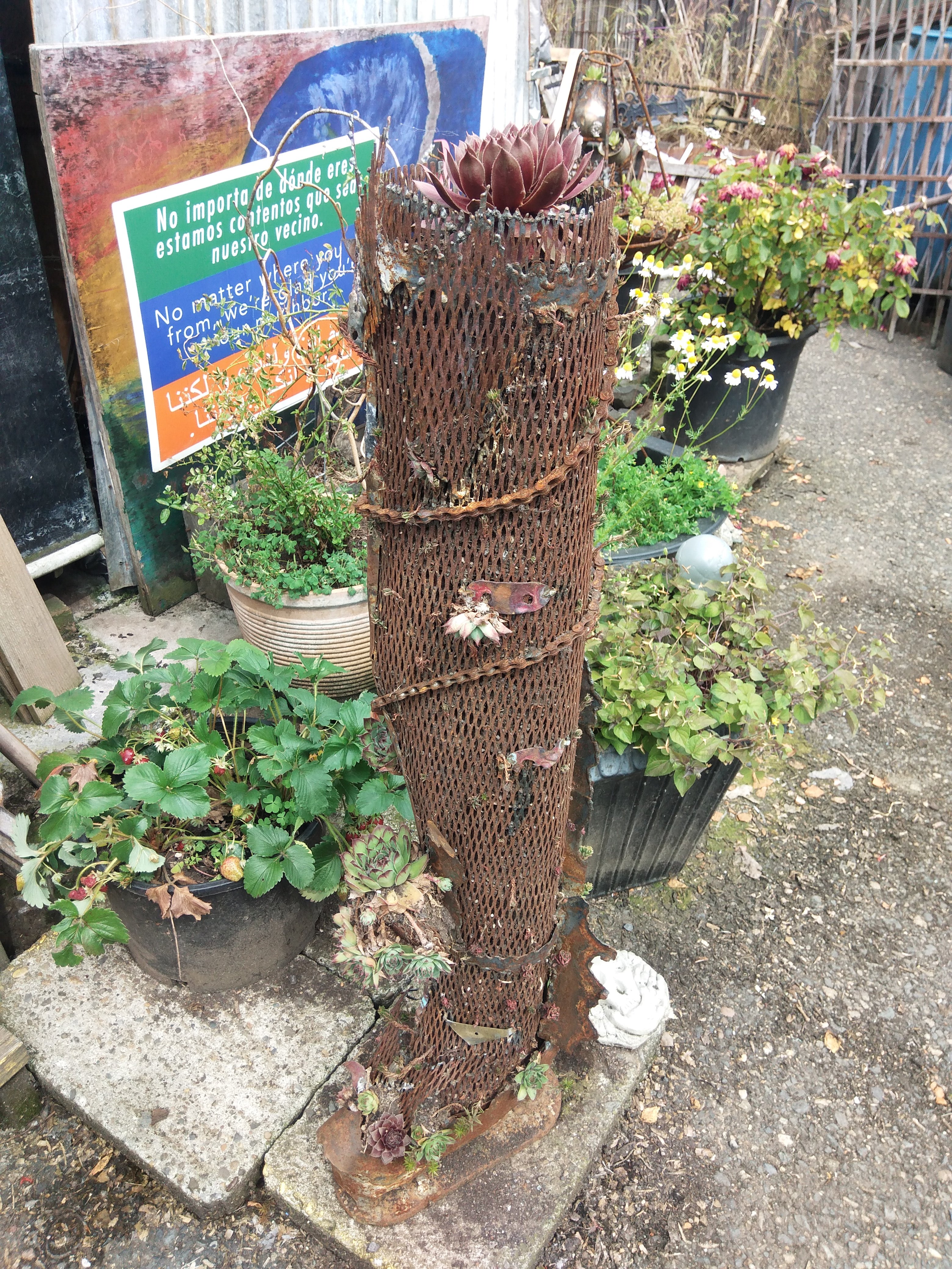 Sauron’s party boot is for sale now, I feel safe enough moving it around, the succulents have taken root and seemed to have nestled in, the sculpture is approximately 3 feet tall steel mesh and planted with 3 or 4 there’s of succulents. I’m asking $200.00 for Sauron’s party boot, half of which will go to support Dignity Village store and general fund, and will need to be picked up upon purchase.