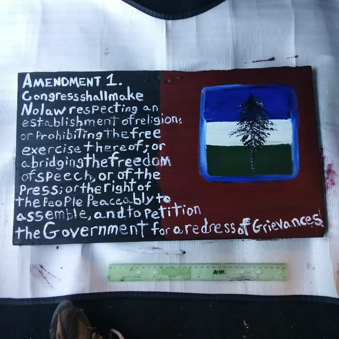As we return to the protests it is necessary to have defense equipment, and Charles pulled out a shield he made back in 2016, he carried it on June 4th. We’ll we stripped the old Street roots signage on it and while he was at work tearing down Saturday market, I was painting the 1st amendment and the flag of Cascadia on it for him, I’m glad he likes.
