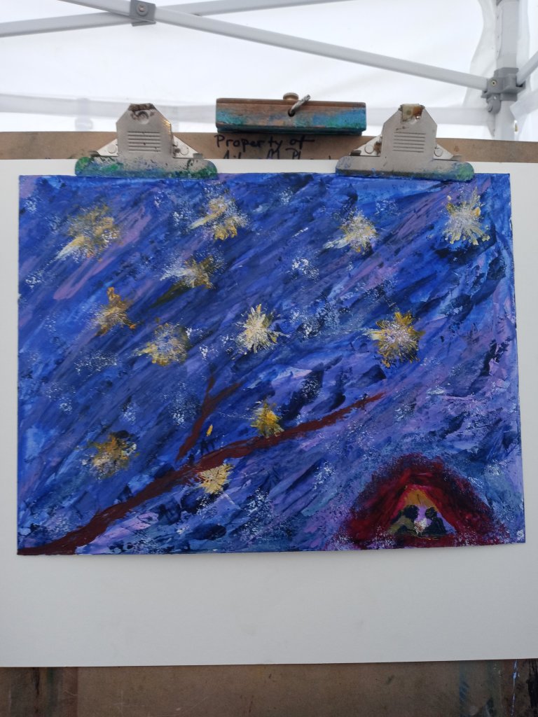 Working on paintings and dealing with village life so tired yet here are some of the painting’s finished and in process. In order Spring, Summer, Autumn, and Winter, and the 20 foot roundthe pencil drawing and the start of the painting, I’m feeling lost on the color scheme, yet I’m going to tackle it first thing in the morning with fresh eyes.