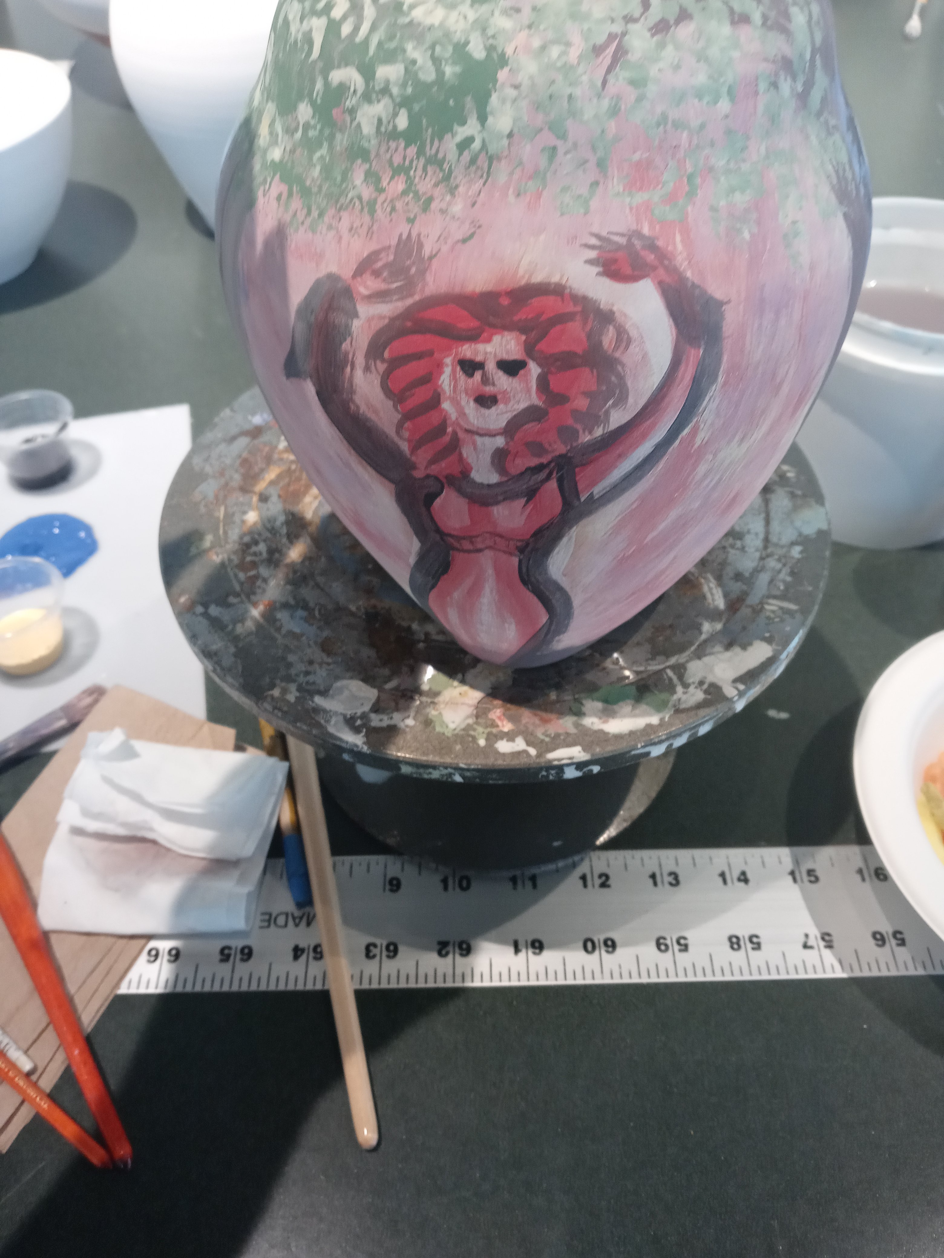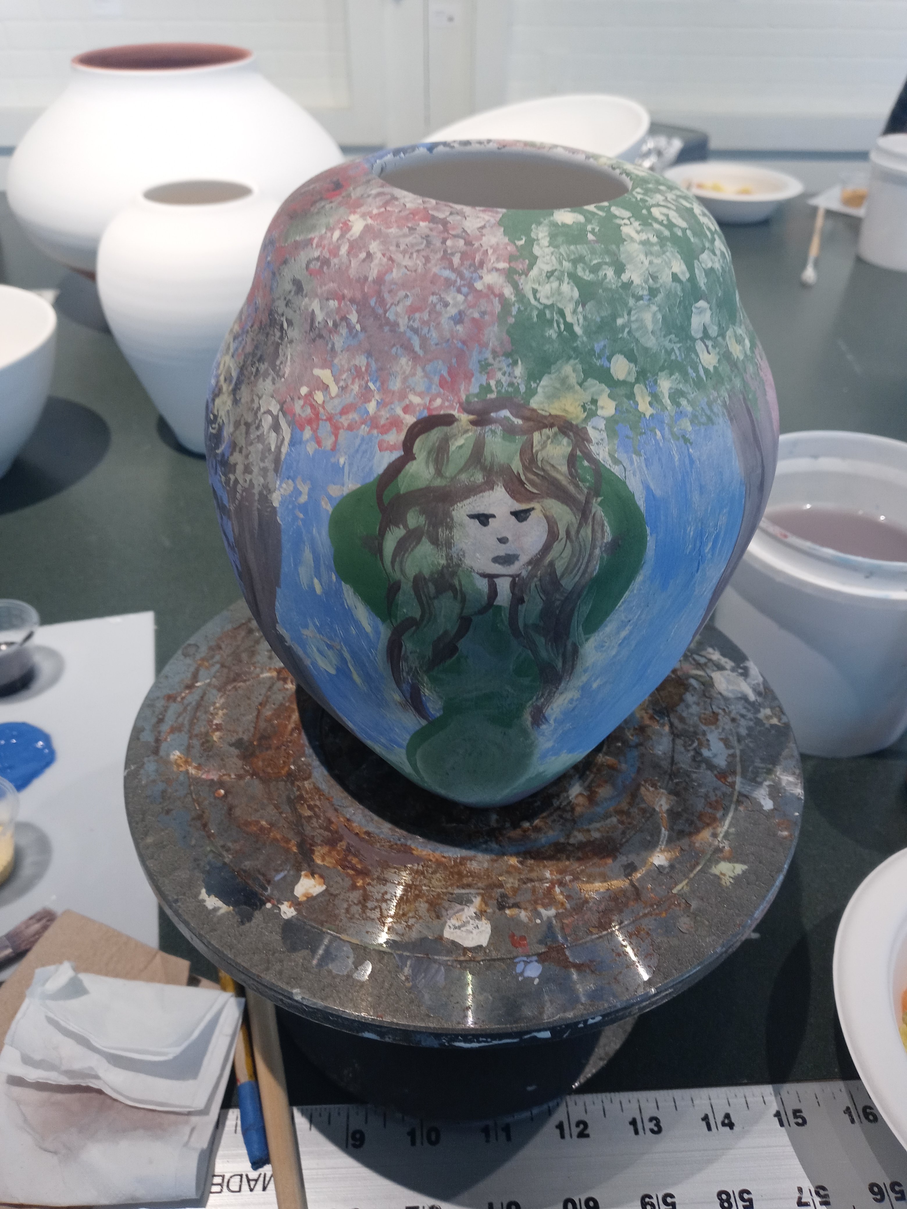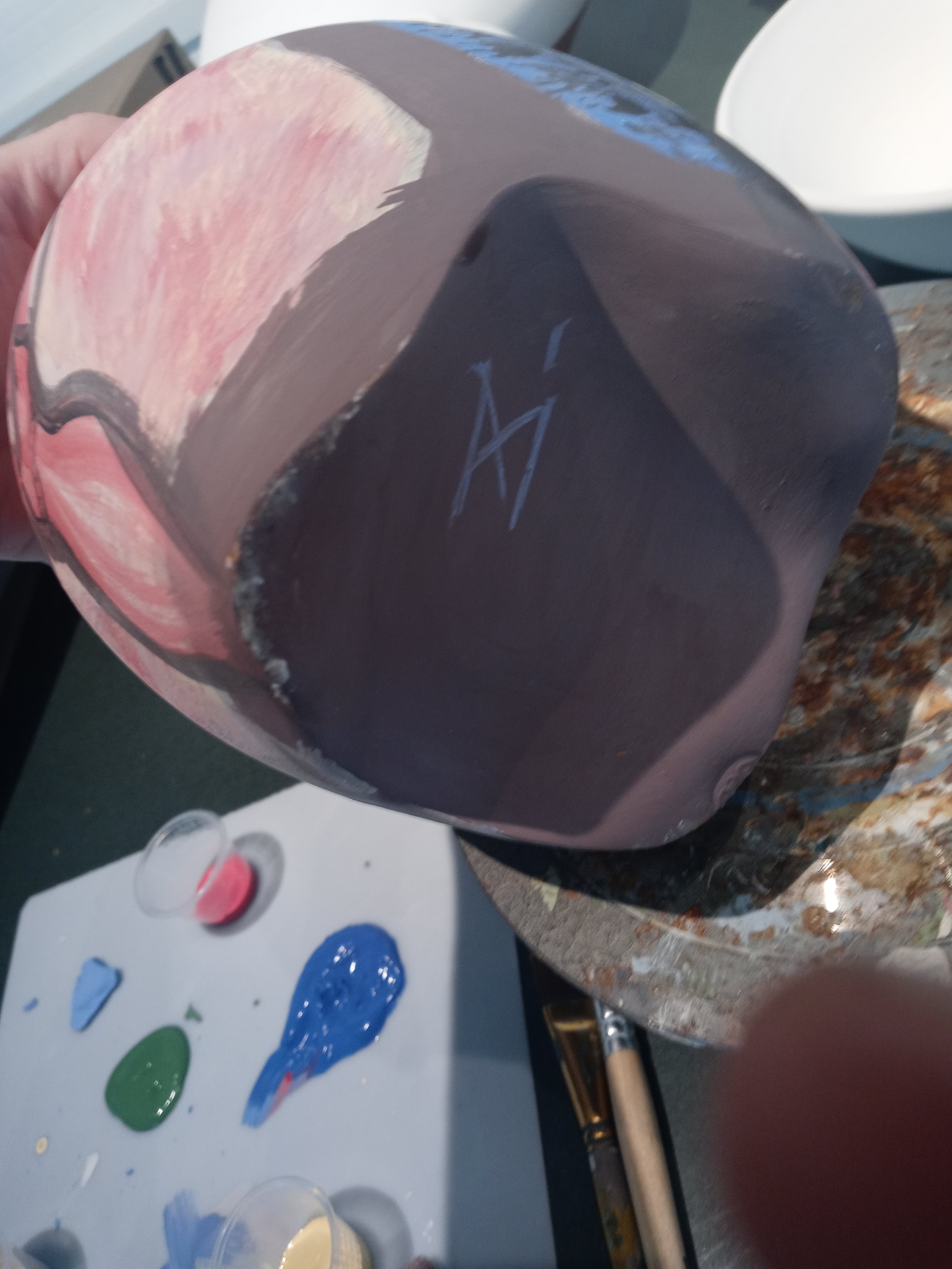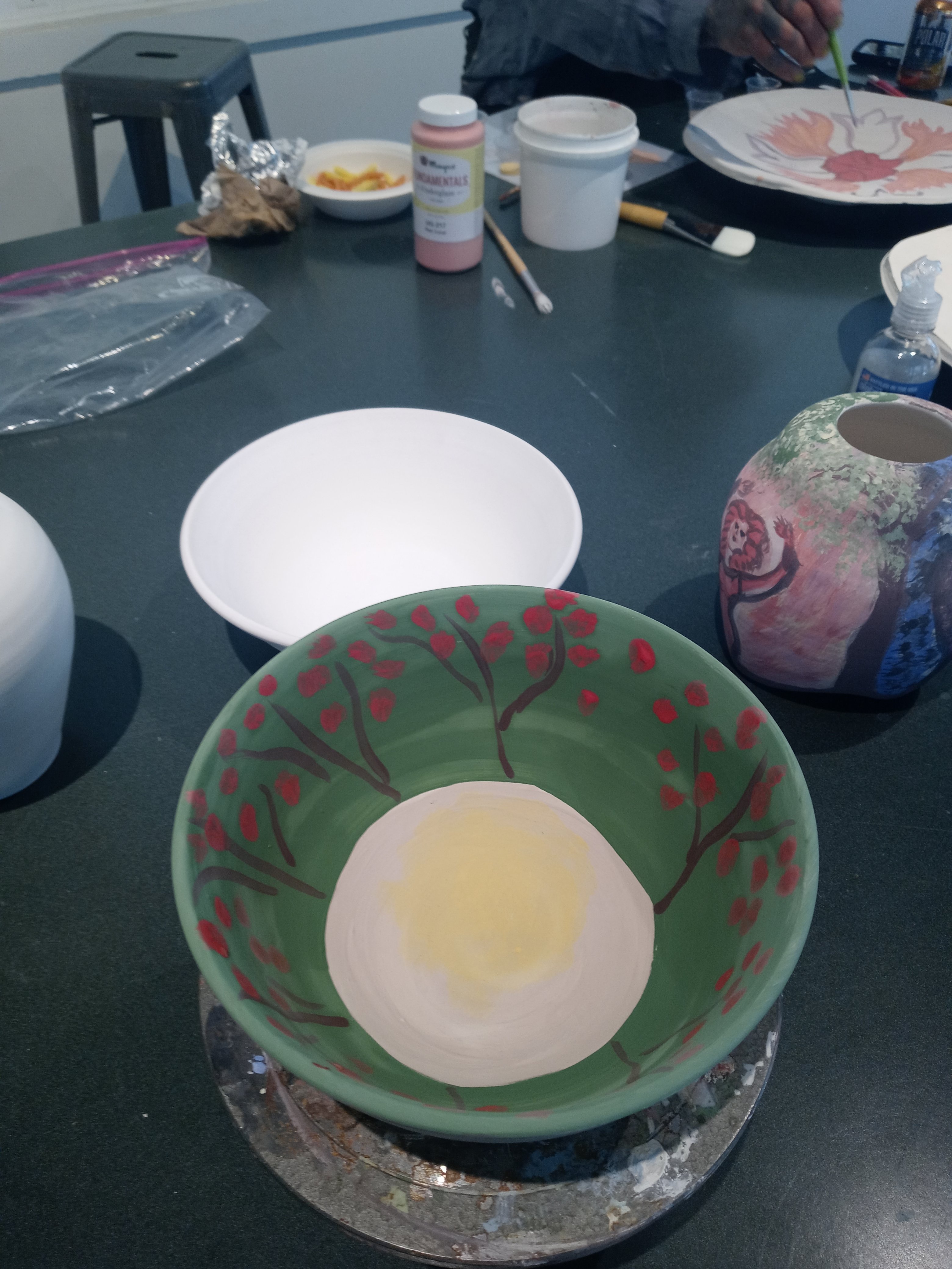I had a good time today seeing Dana and Maddie and I met Josh and we painted pottery this is my pottery from Sarah who I’m going to miss when she leaves I hope I get to see her before then. The one pot is called the three muses and the other one is possibly just going to be called breakfast it was my the last of my paints from after finishing off the muses I like doing that it’s fun no waste.