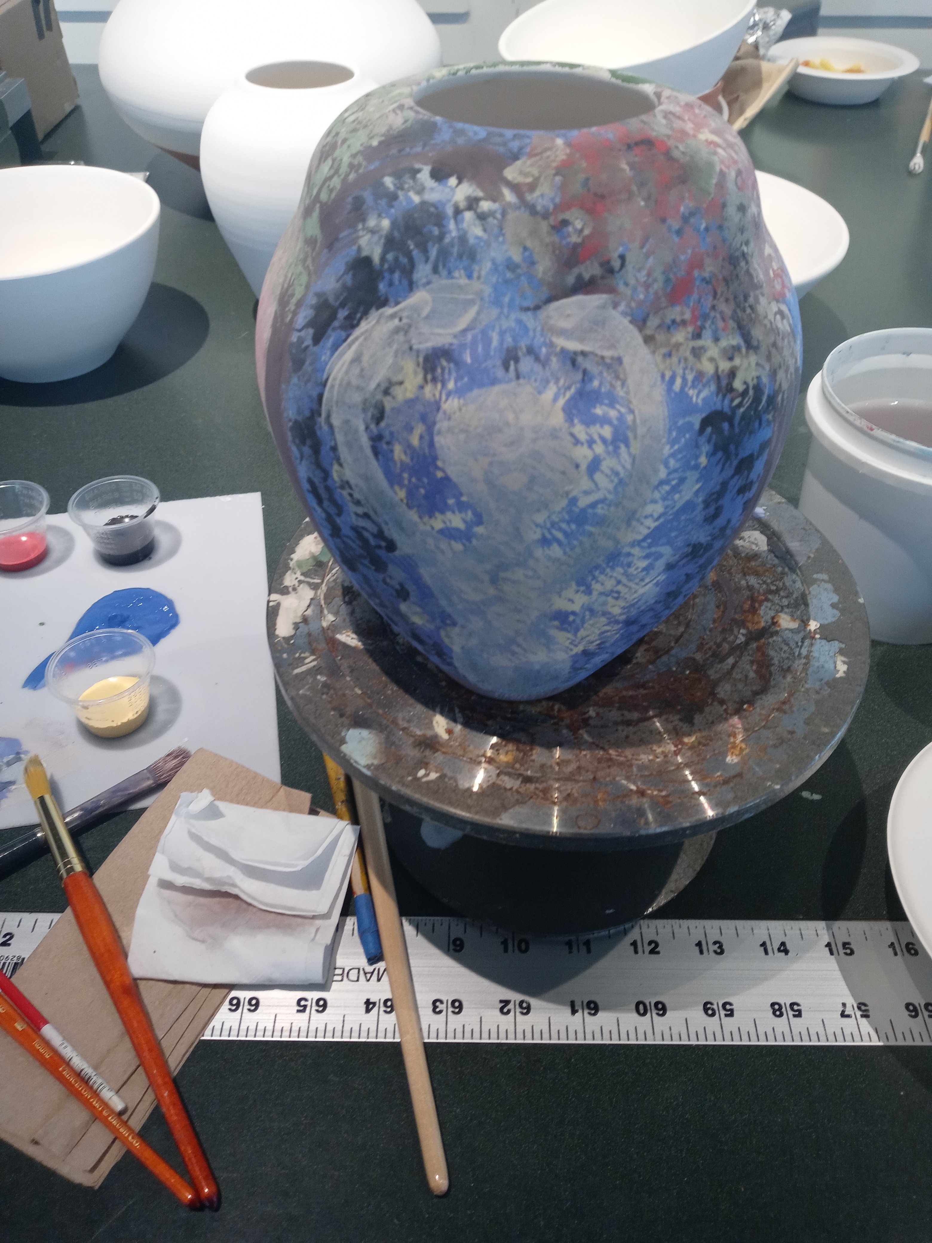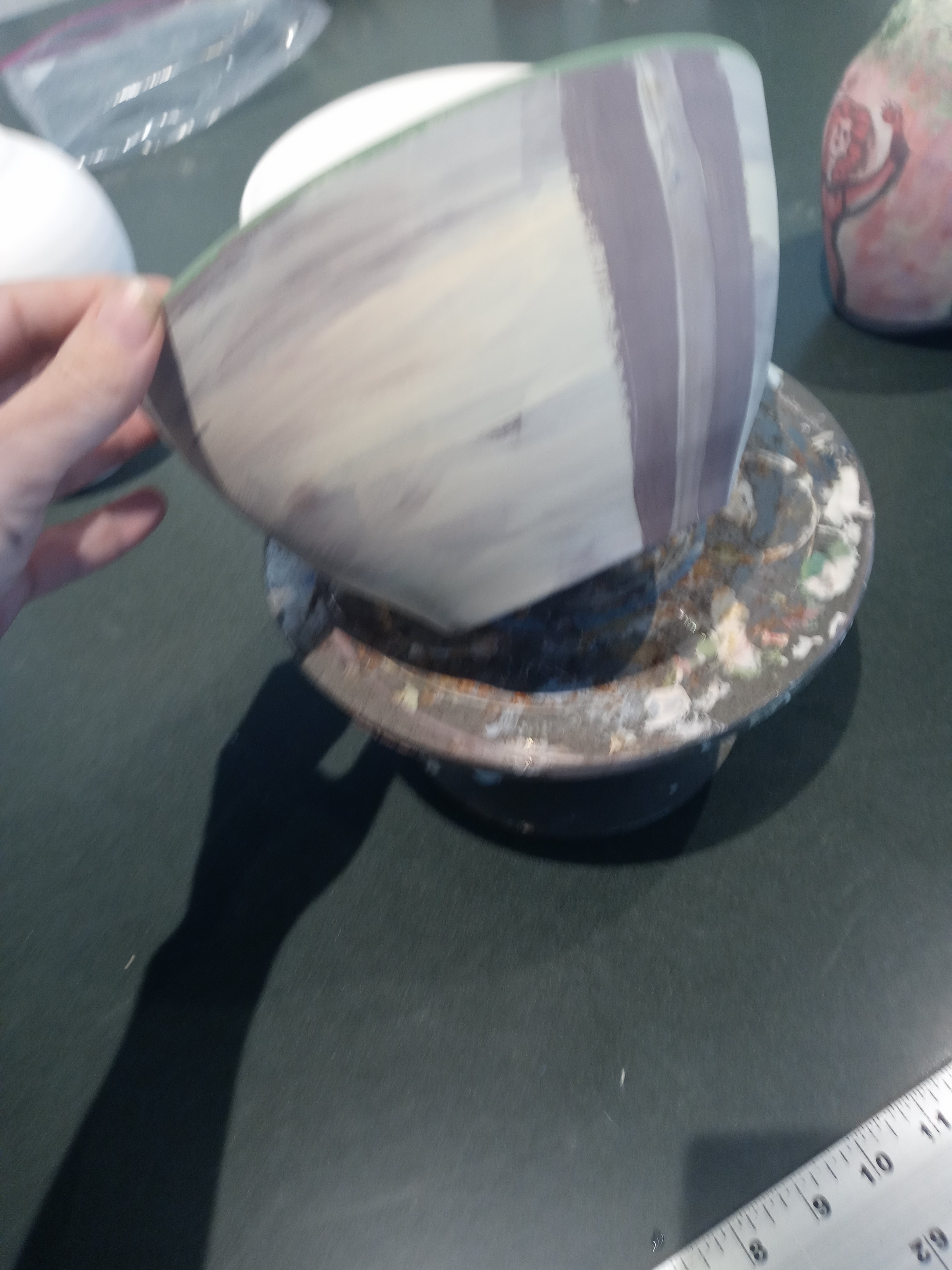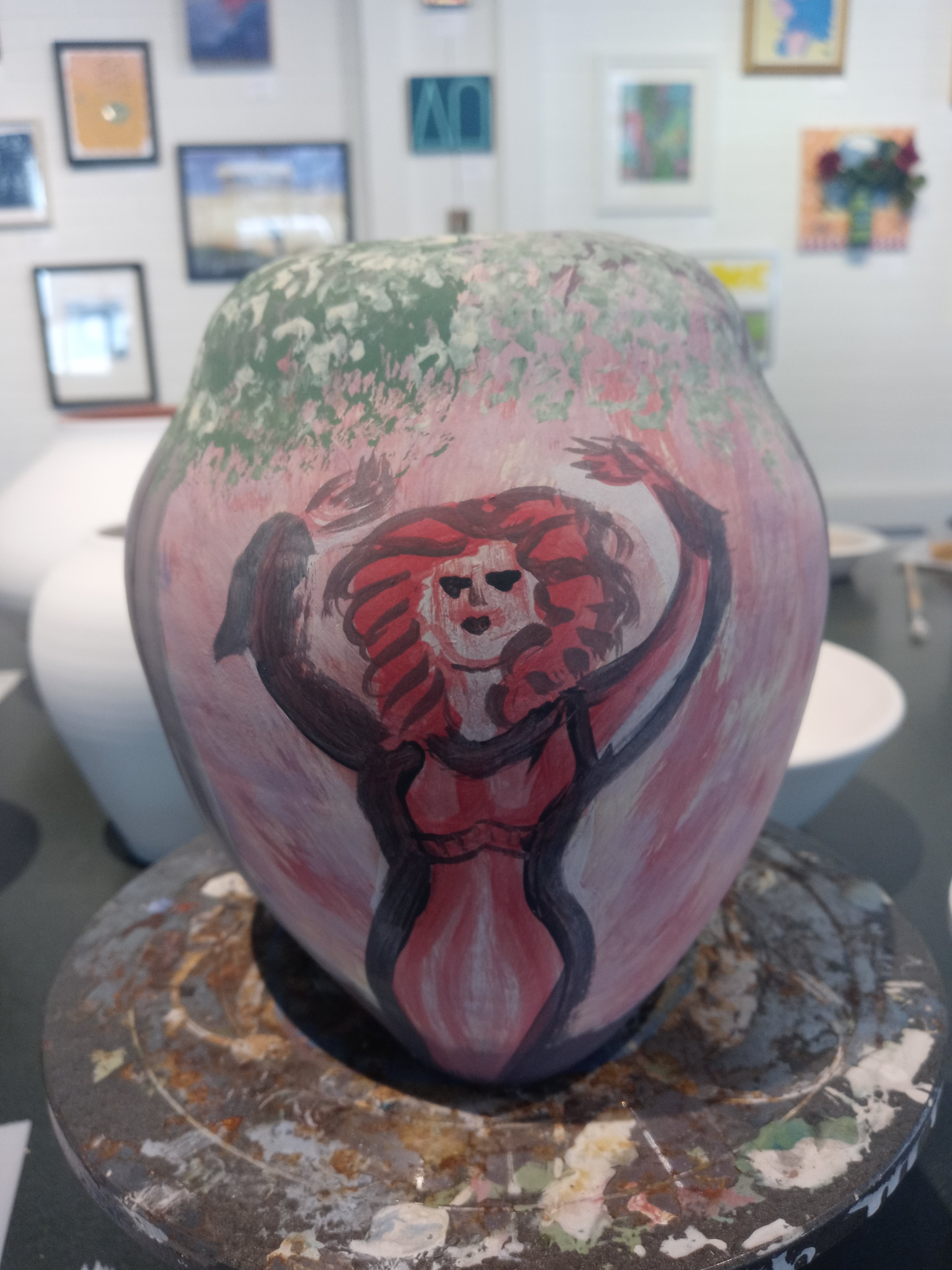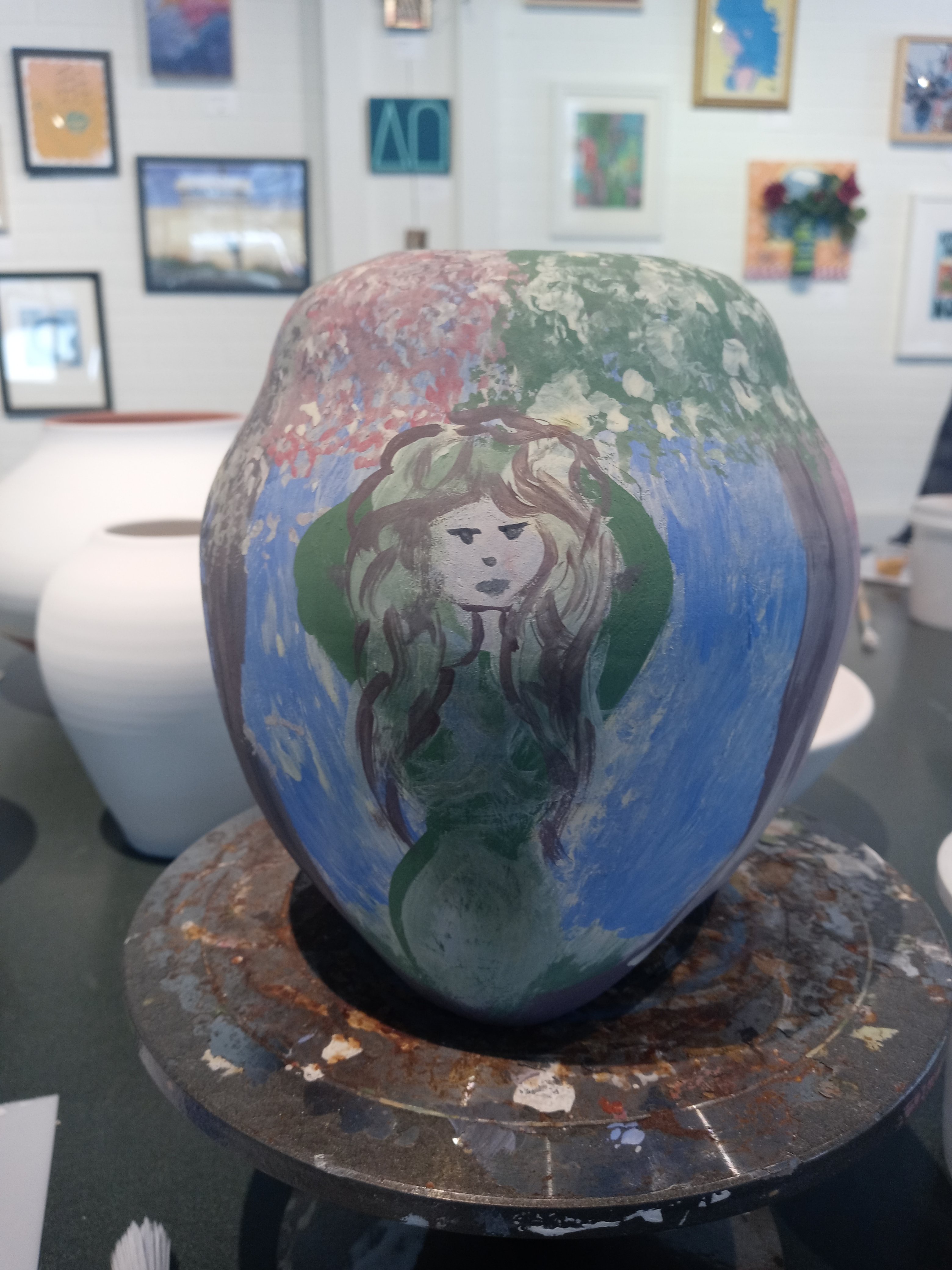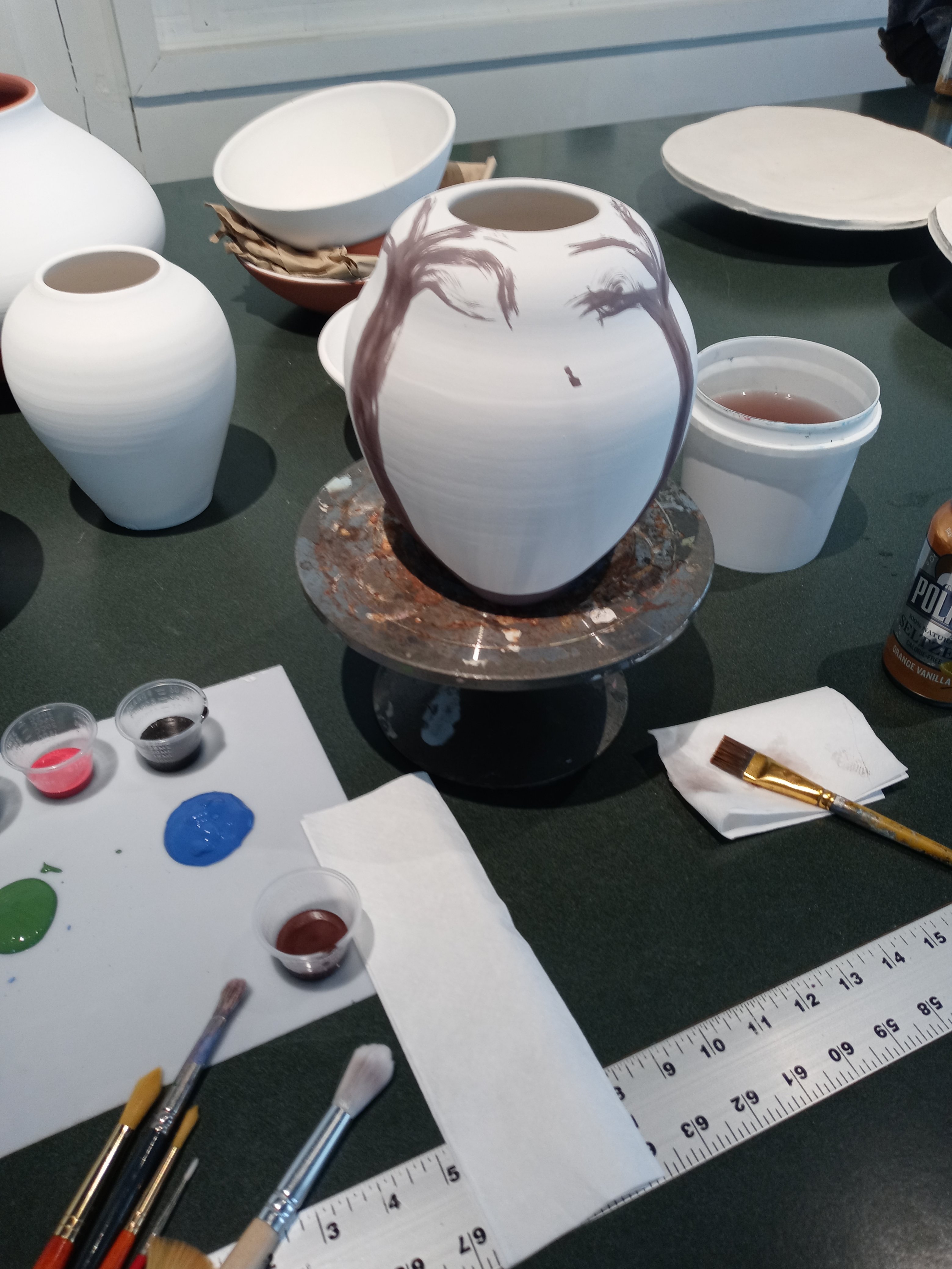 I had a good time today seeing Dana and Maddie and I met Josh and we painted pottery this is my pottery from Sarah who I’m going to miss when she leaves I hope I get to see her before then. The one pot is called the three muses and the other one is possibly just going to be called breakfast it was my the last of my paints from after finishing off the muses I like doing that it’s fun no waste.