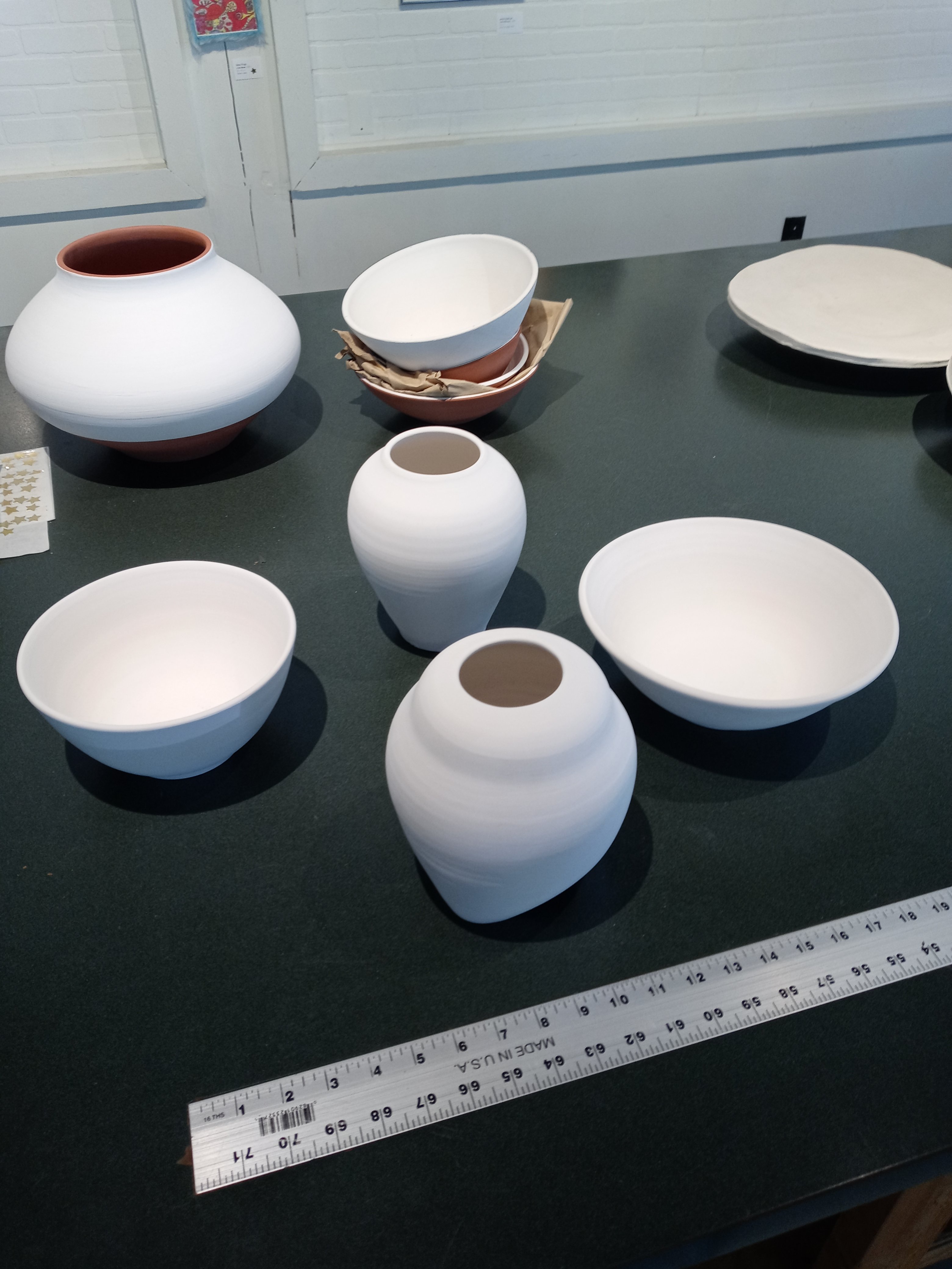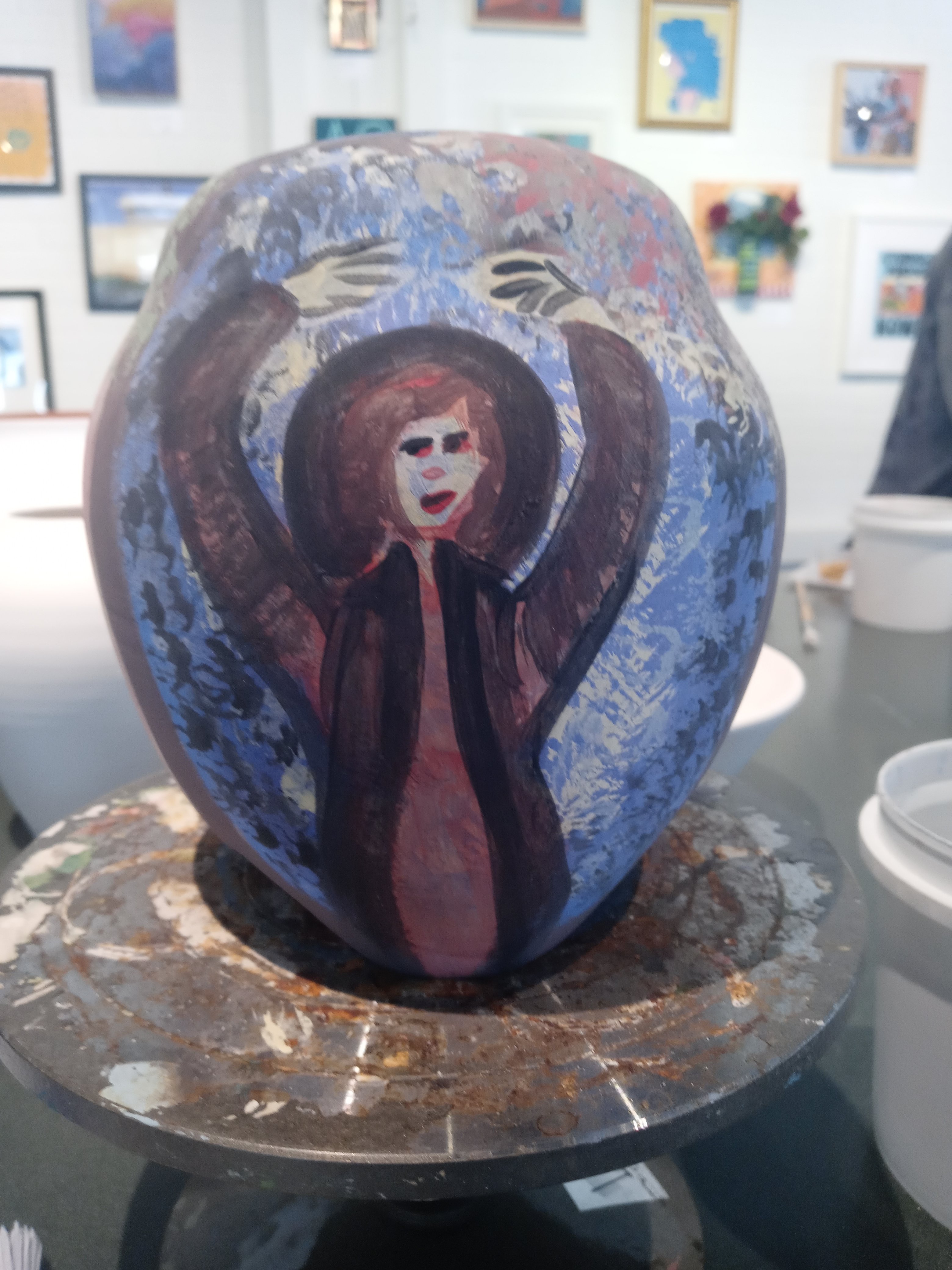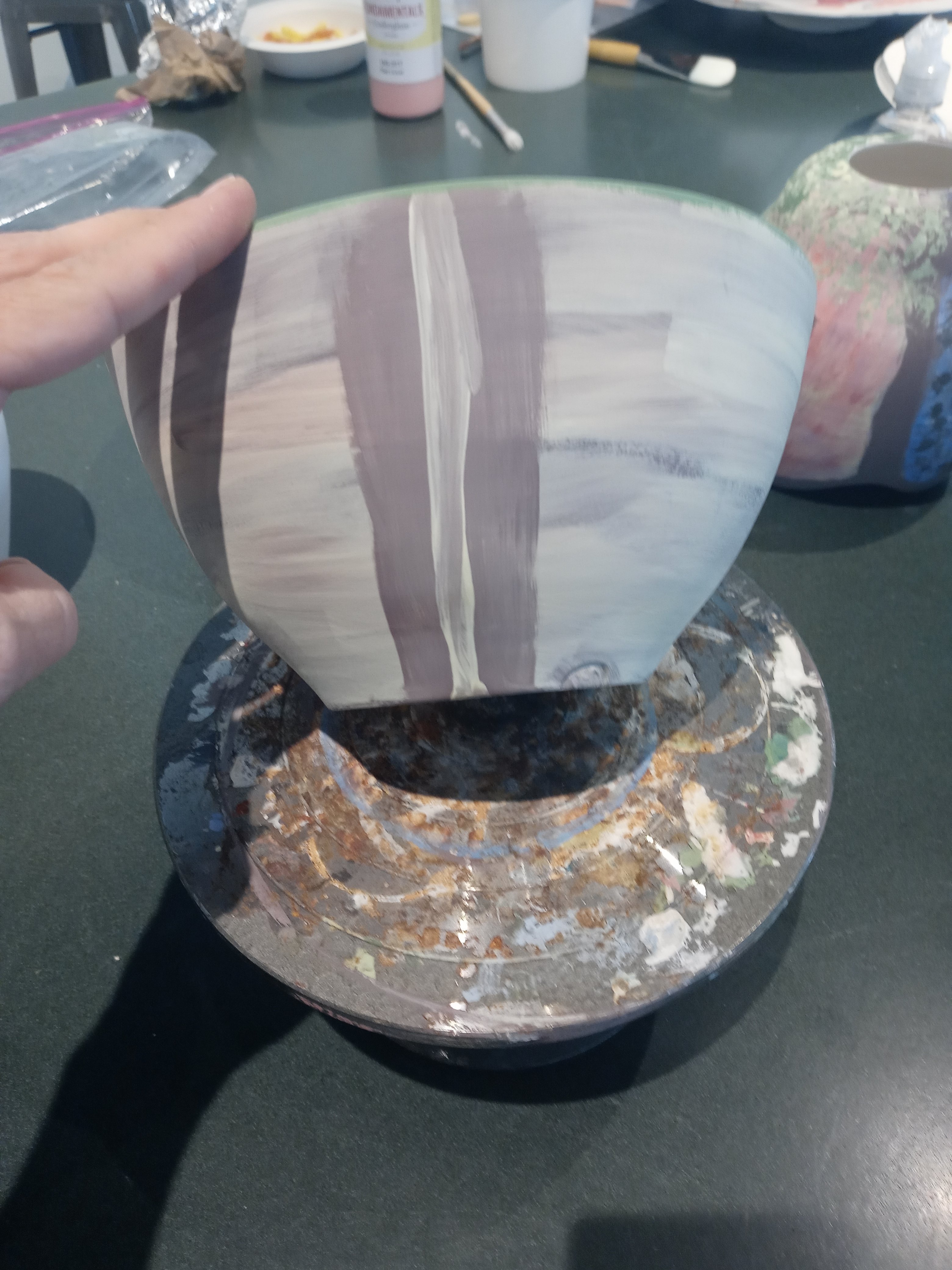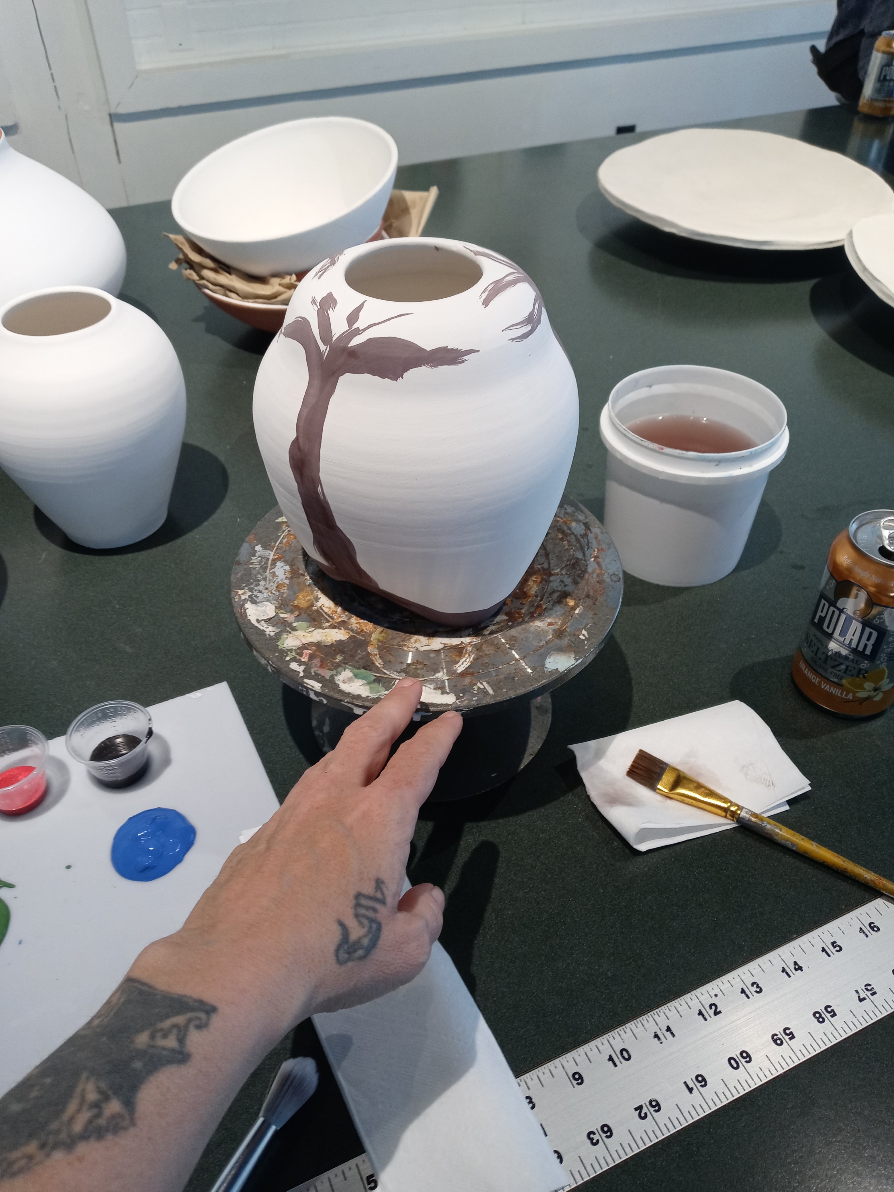 I had a good time today seeing Dana and Maddie and I met Josh and we painted pottery this is my pottery from Sarah who I’m going to miss when she leaves I hope I get to see her before then. The one pot is called the three muses and the other one is possibly just going to be called breakfast it was my the last of my paints from after finishing off the muses I like doing that it’s fun no waste.