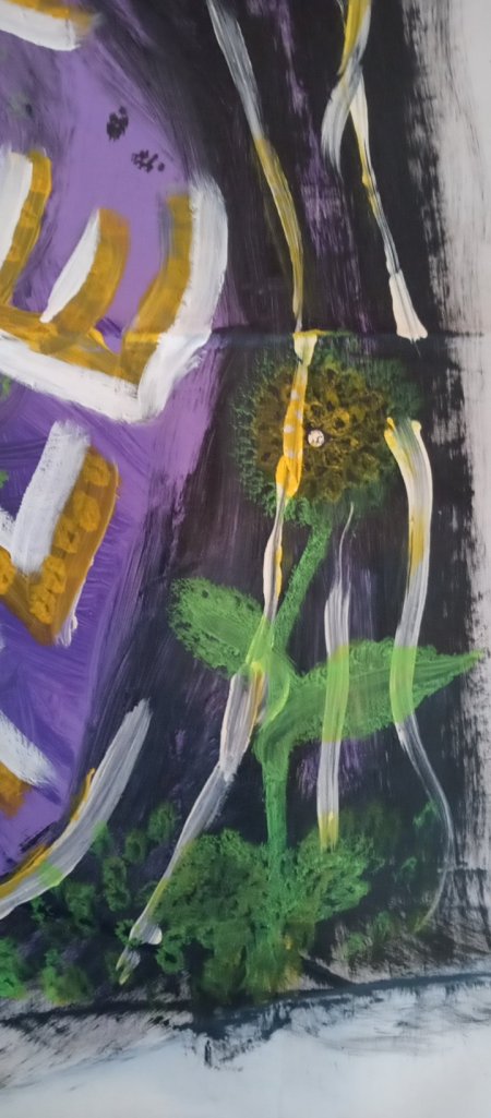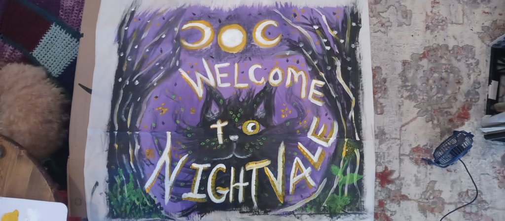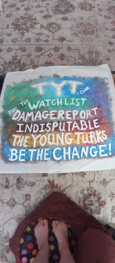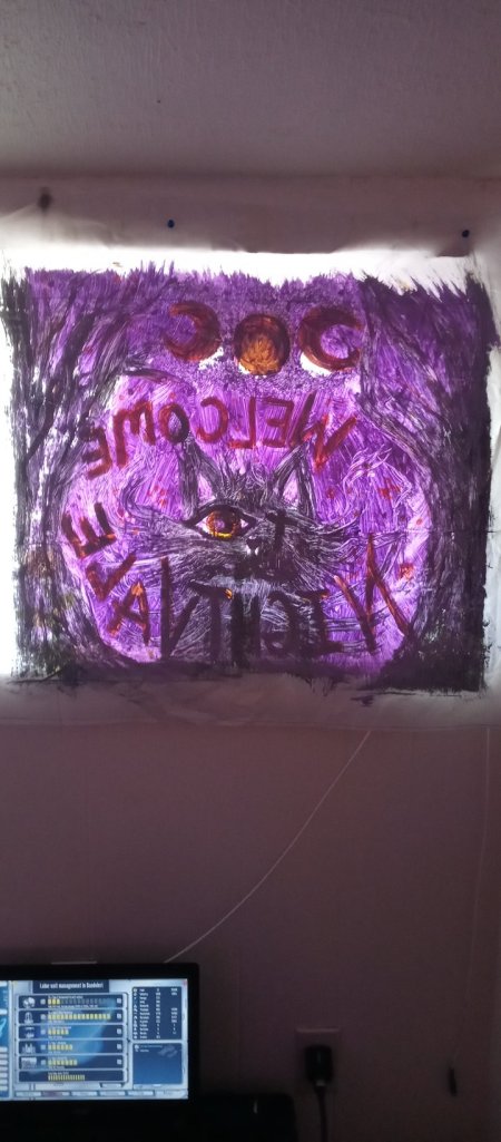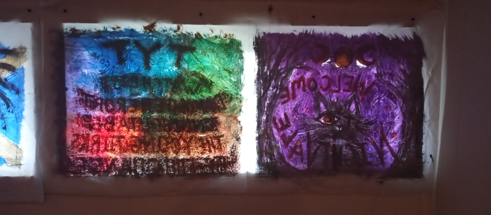 So my husband and I wanted to do something nice and beautiful for our windows that also reflected are moral and political statements so we took some nylon fabric that had been walls to some old to an old tent we had and I cut them to fit the windows and I painted them and this is what we came up with. One for our favorite podcast Welcome to Night Vale and the other is the lineup of our favorite tyt news shows that we listen to on a regular basis.