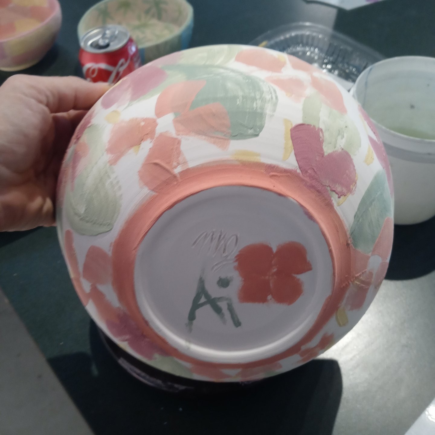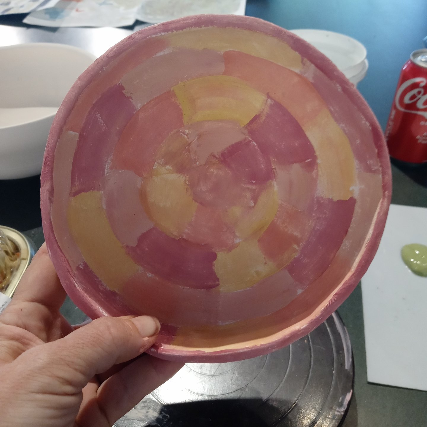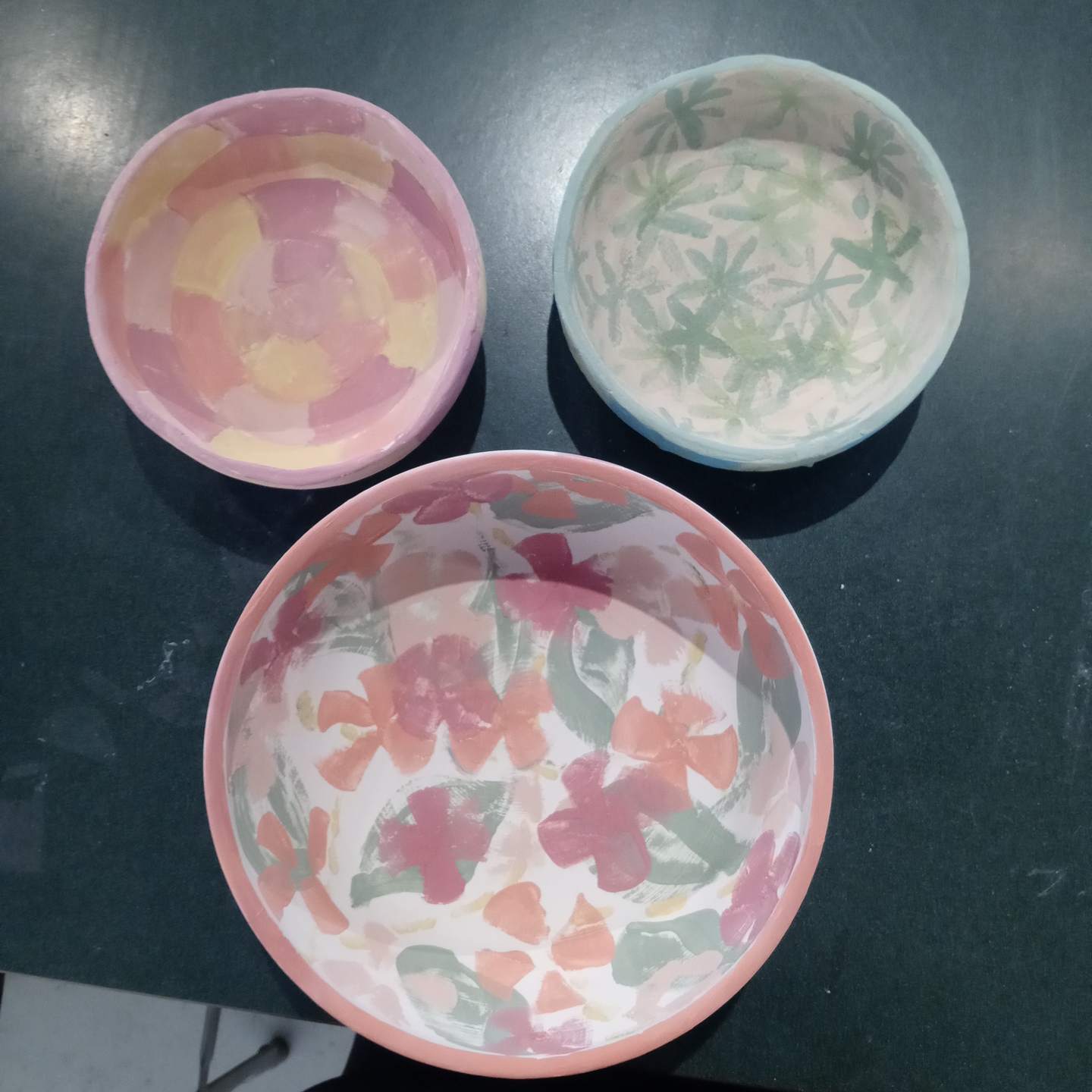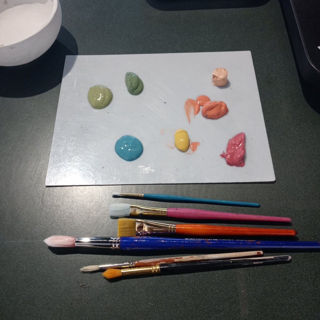 These are the 3 New bowls I’ve painted for Gather Make Shelter , the 2 small bowls were made by Grant high school students and I’m not sure who the large bowl is I don’t recognize their mark. However here they are, I’ve been having some emotional upsets and using color therapy when I paint both last week and this week. I ask myself what am I feeling, what colors call to me, and then I choose my brushes I usually end up using 1 brush out of 4 or 5 , and then my first color and begin until all the paint is gone, I should always have just enough paint to color every bowl chosen and leave a mostly clean palette.