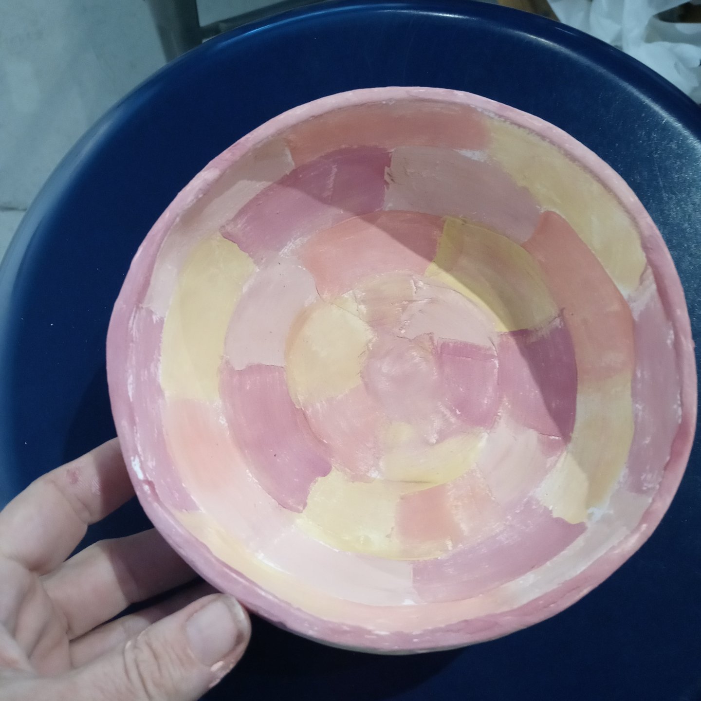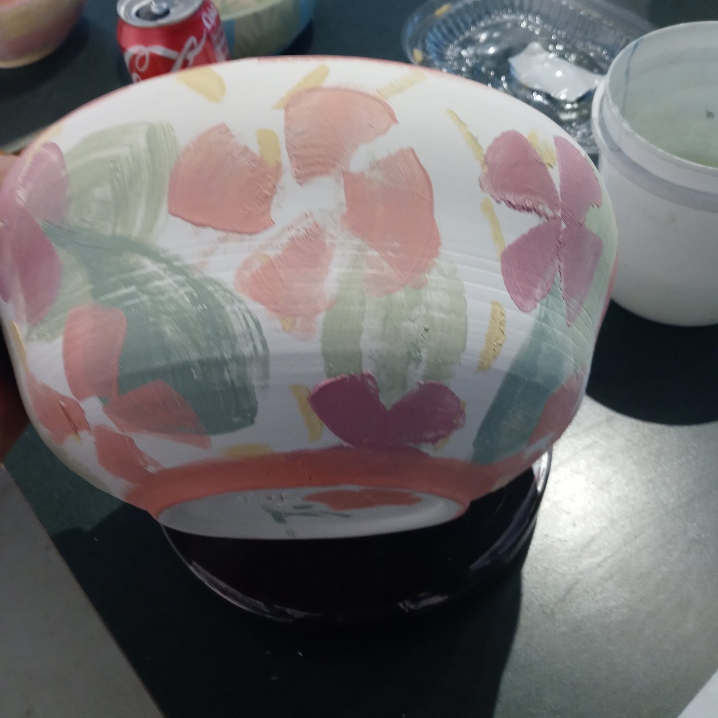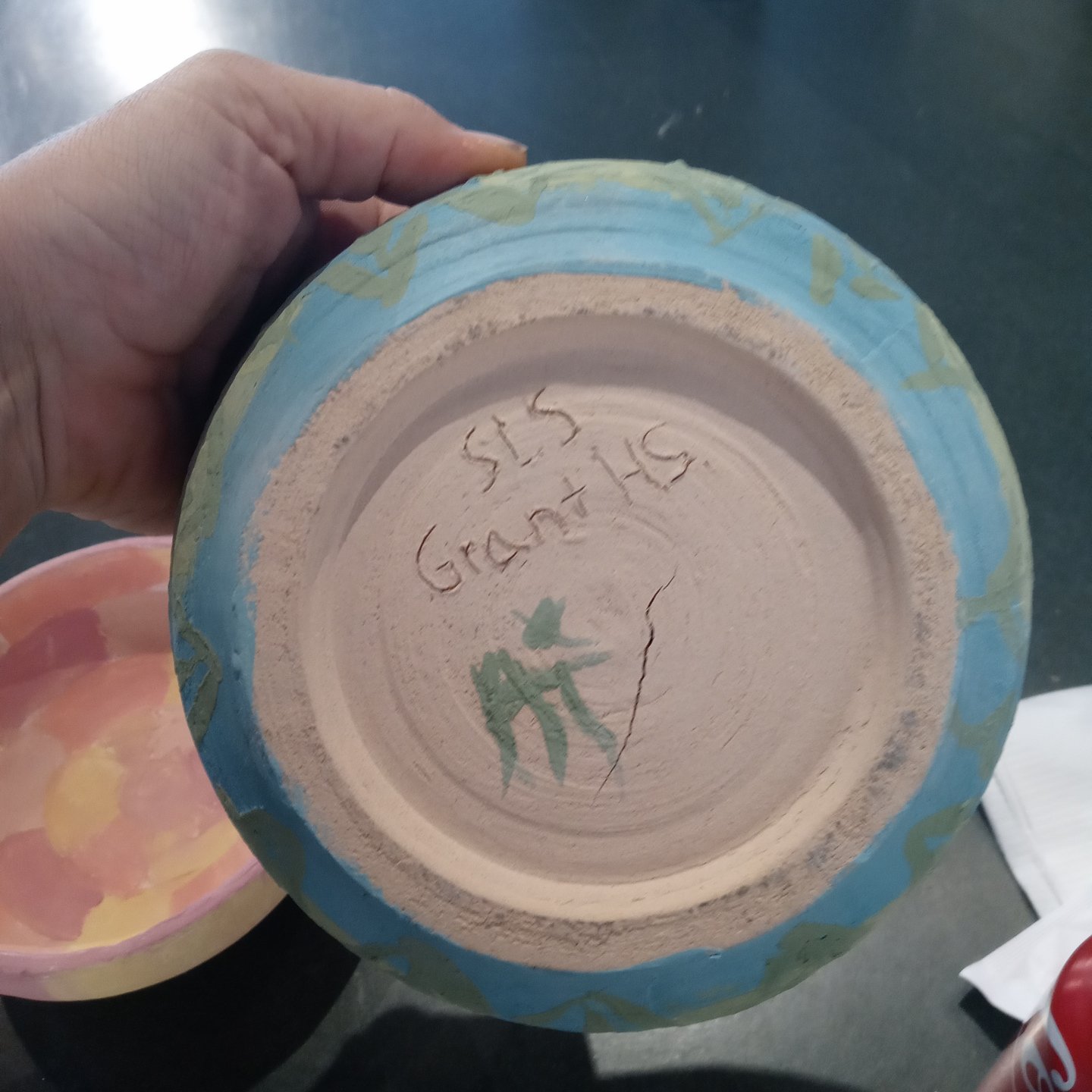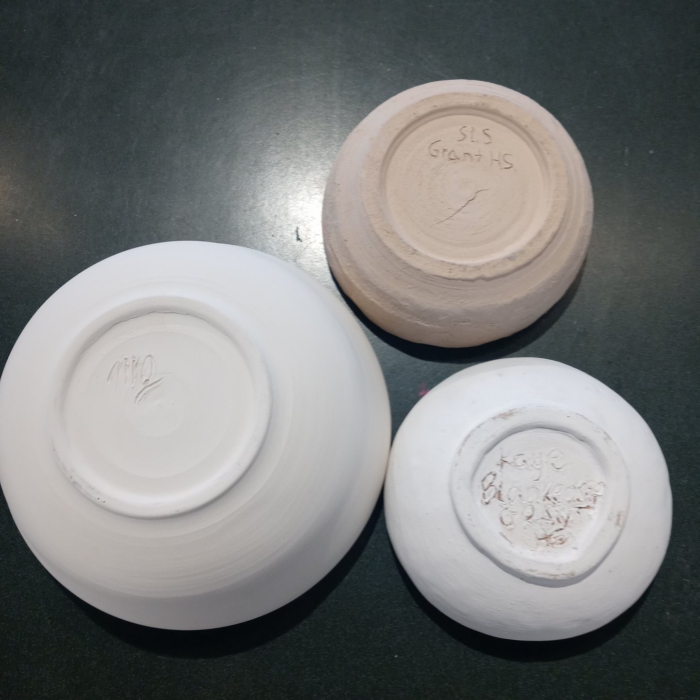 These are the 3 New bowls I’ve painted for Gather Make Shelter , the 2 small bowls were made by Grant high school students and I’m not sure who the large bowl is I don’t recognize their mark. However here they are, I’ve been having some emotional upsets and using color therapy when I paint both last week and this week. I ask myself what am I feeling, what colors call to me, and then I choose my brushes I usually end up using 1 brush out of 4 or 5 , and then my first color and begin until all the paint is gone, I should always have just enough paint to color every bowl chosen and leave a mostly clean palette.