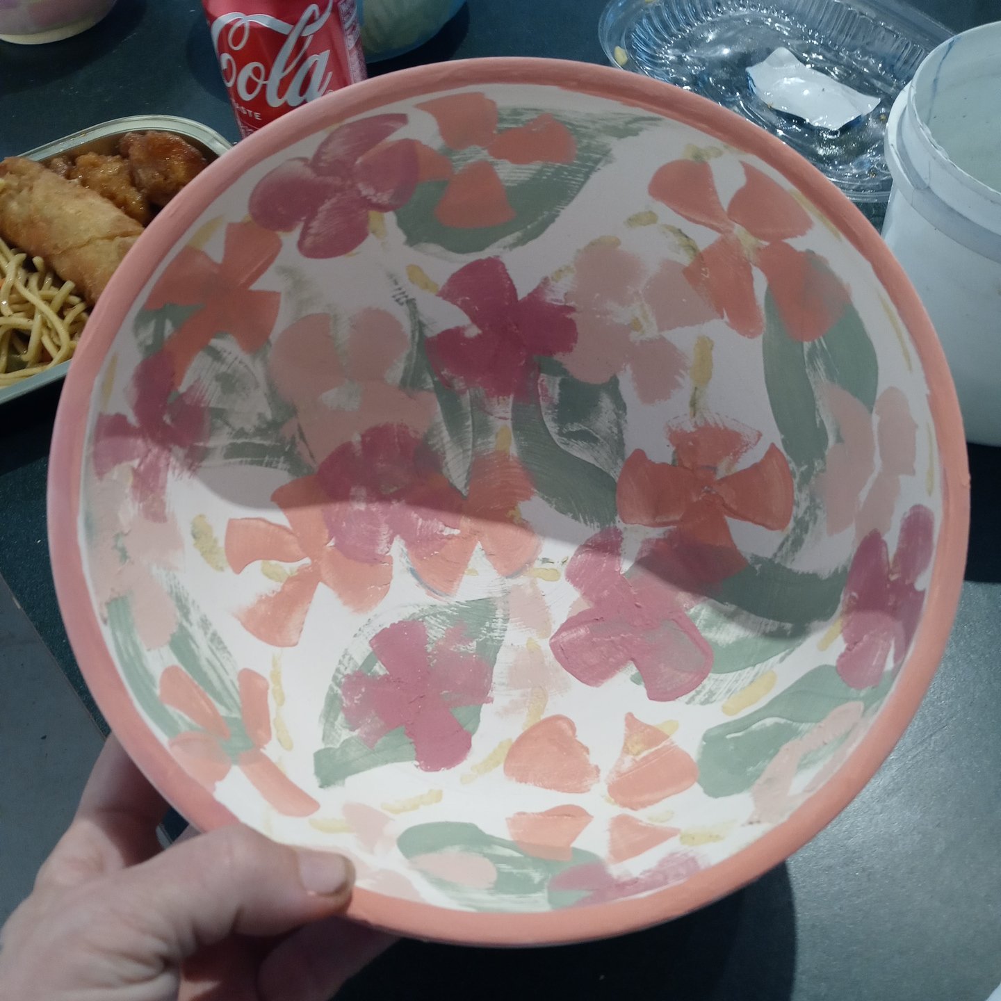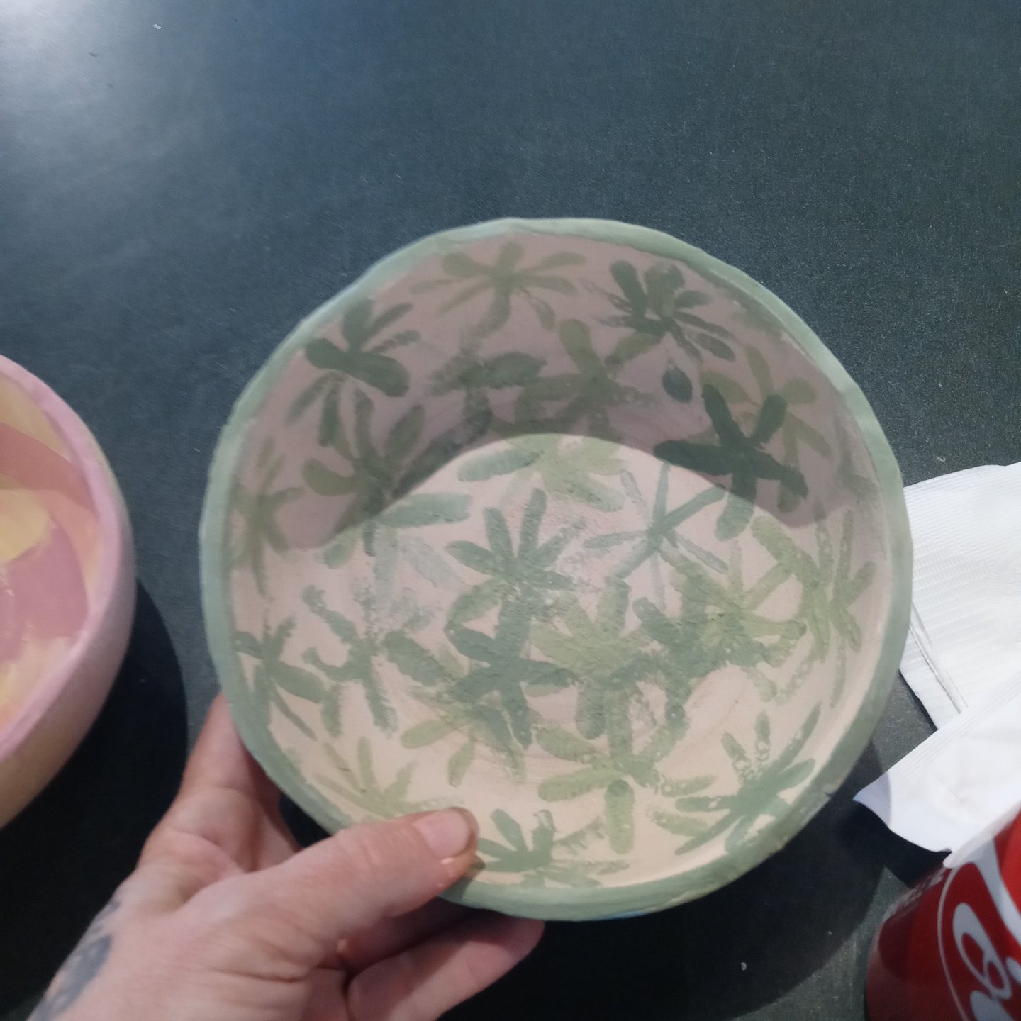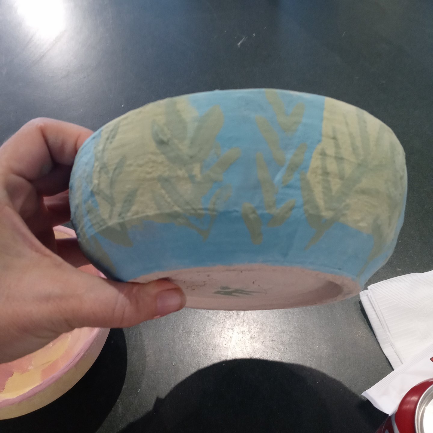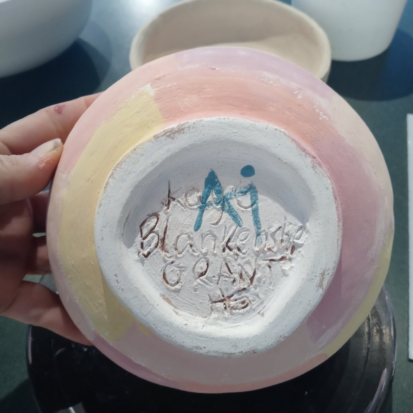 These are the 3 New bowls I’ve painted for Gather Make Shelter , the 2 small bowls were made by Grant high school students and I’m not sure who the large bowl is I don’t recognize their mark. However here they are, I’ve been having some emotional upsets and using color therapy when I paint both last week and this week. I ask myself what am I feeling, what colors call to me, and then I choose my brushes I usually end up using 1 brush out of 4 or 5 , and then my first color and begin until all the paint is gone, I should always have just enough paint to color every bowl chosen and leave a mostly clean palette.