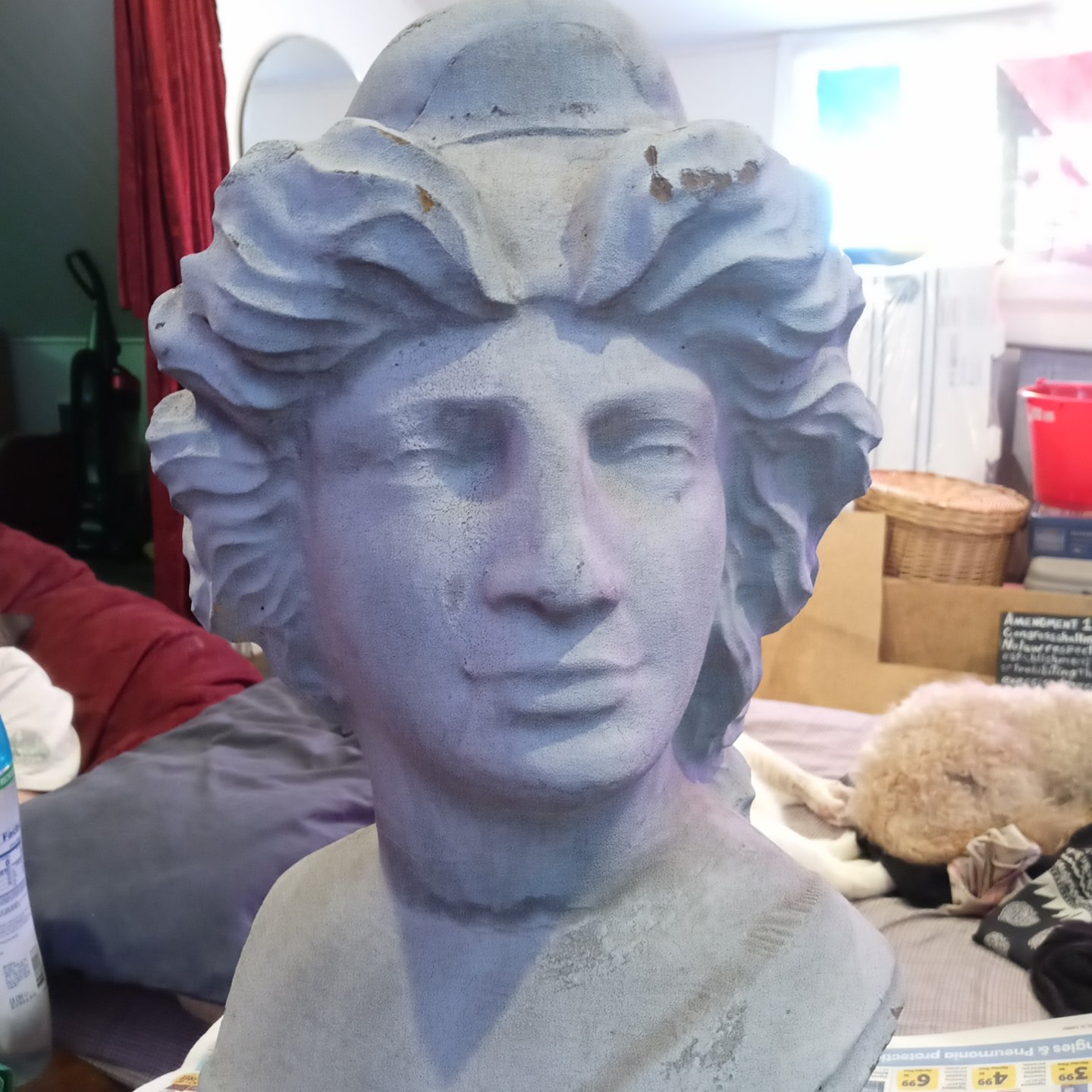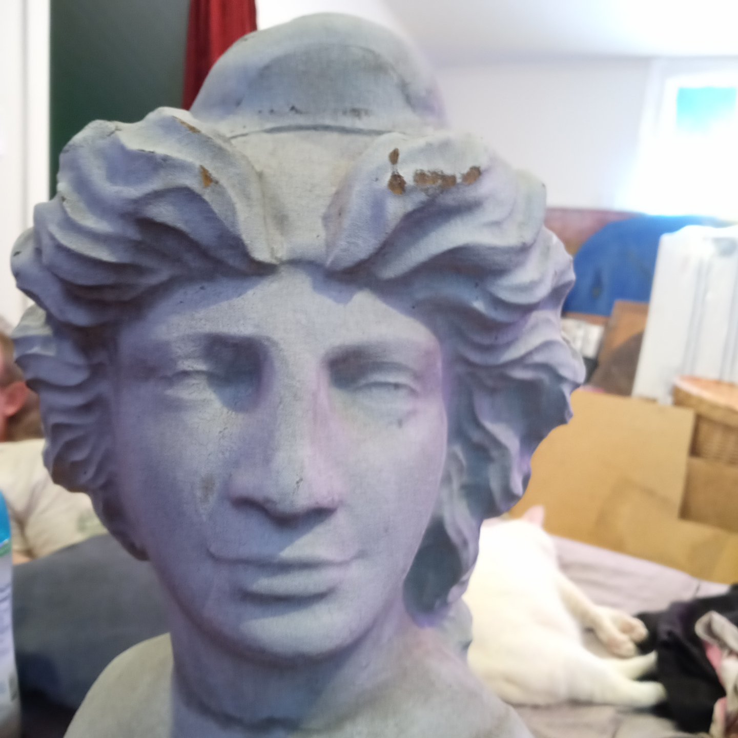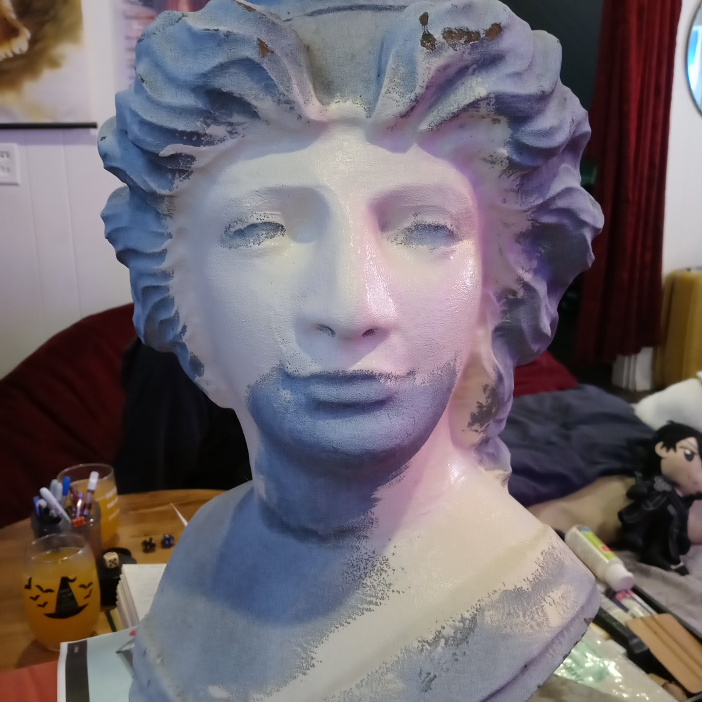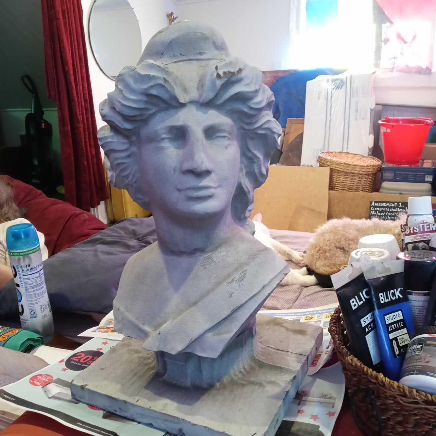 So I inherited this styrofoam Greco Roman Bust when I got my tiny home when I lived in a homeless village, and the prior resident when moving out brought me and my husband over and began showing us everything she would be leaving and this was amongst the treasures.