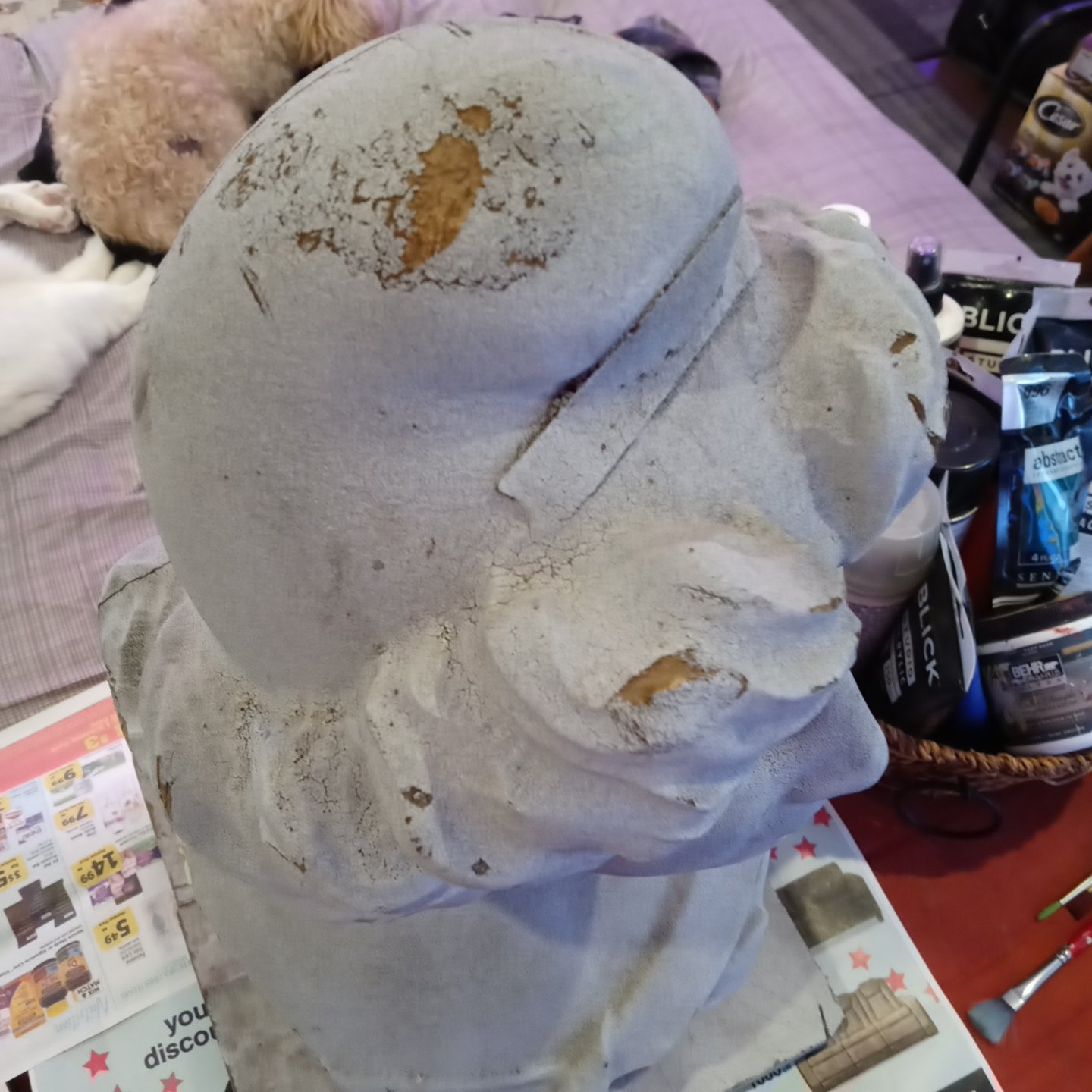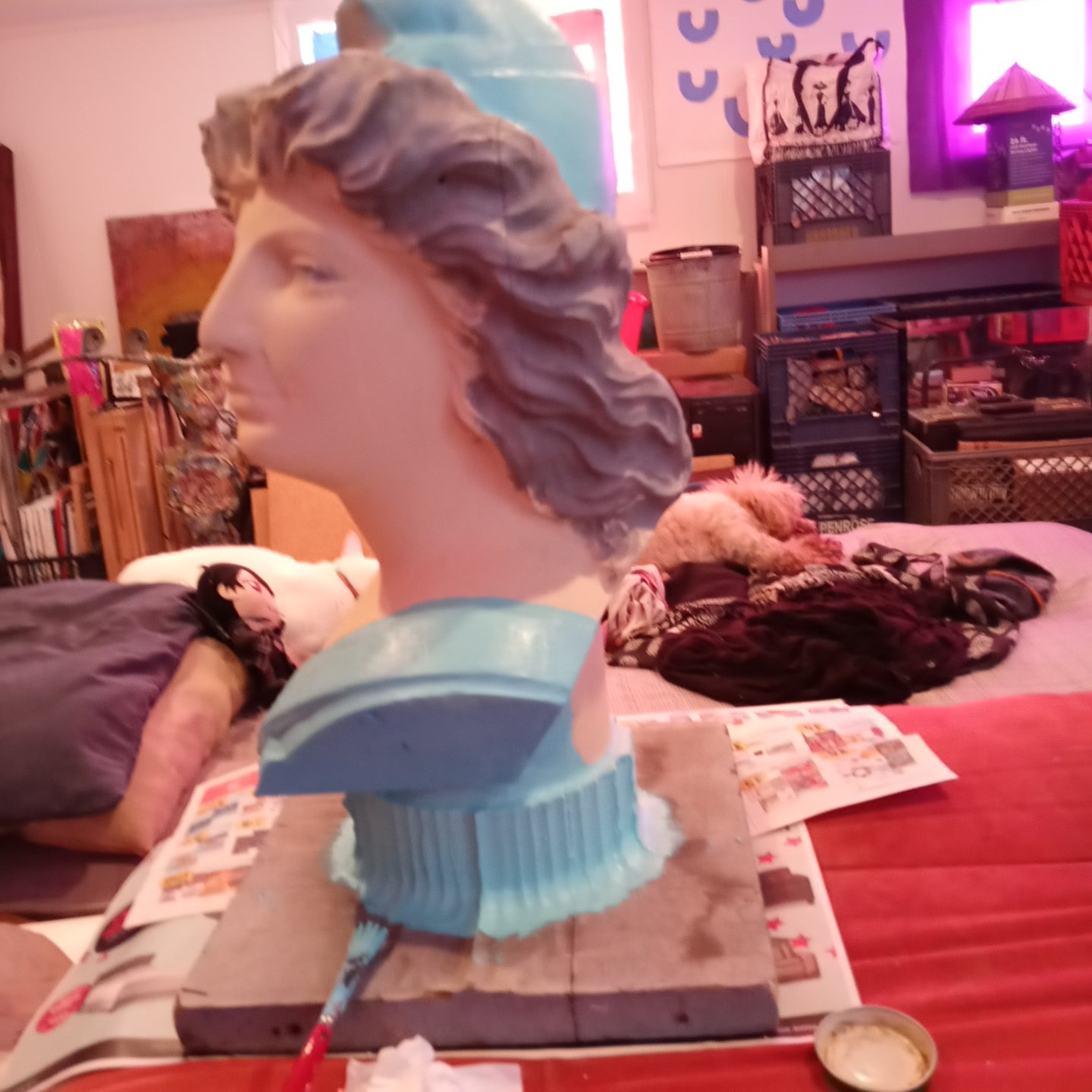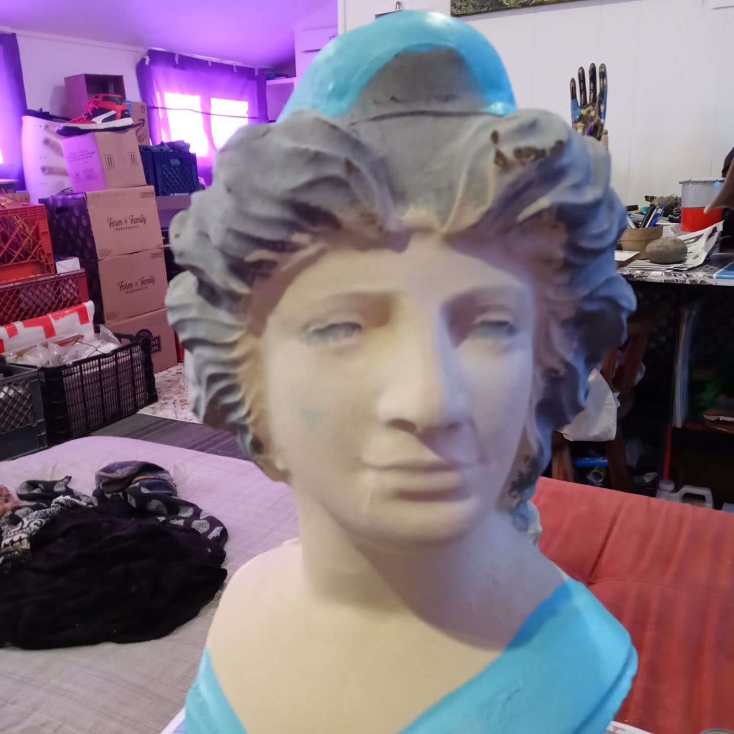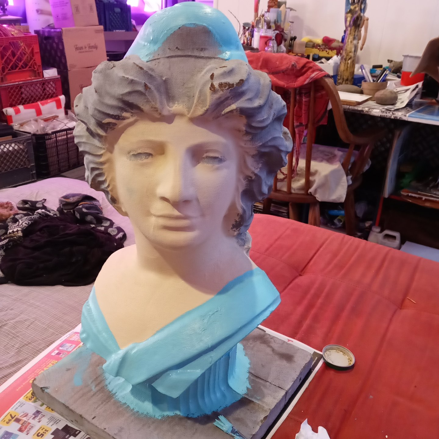 So I inherited this styrofoam Greco Roman Bust when I got my tiny home when I lived in a homeless village, and the prior resident when moving out brought me and my husband over and began showing us everything she would be leaving and this was amongst the treasures.