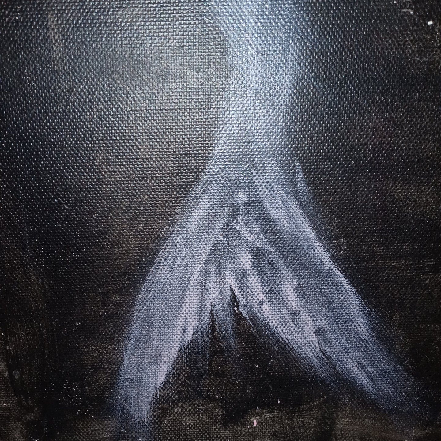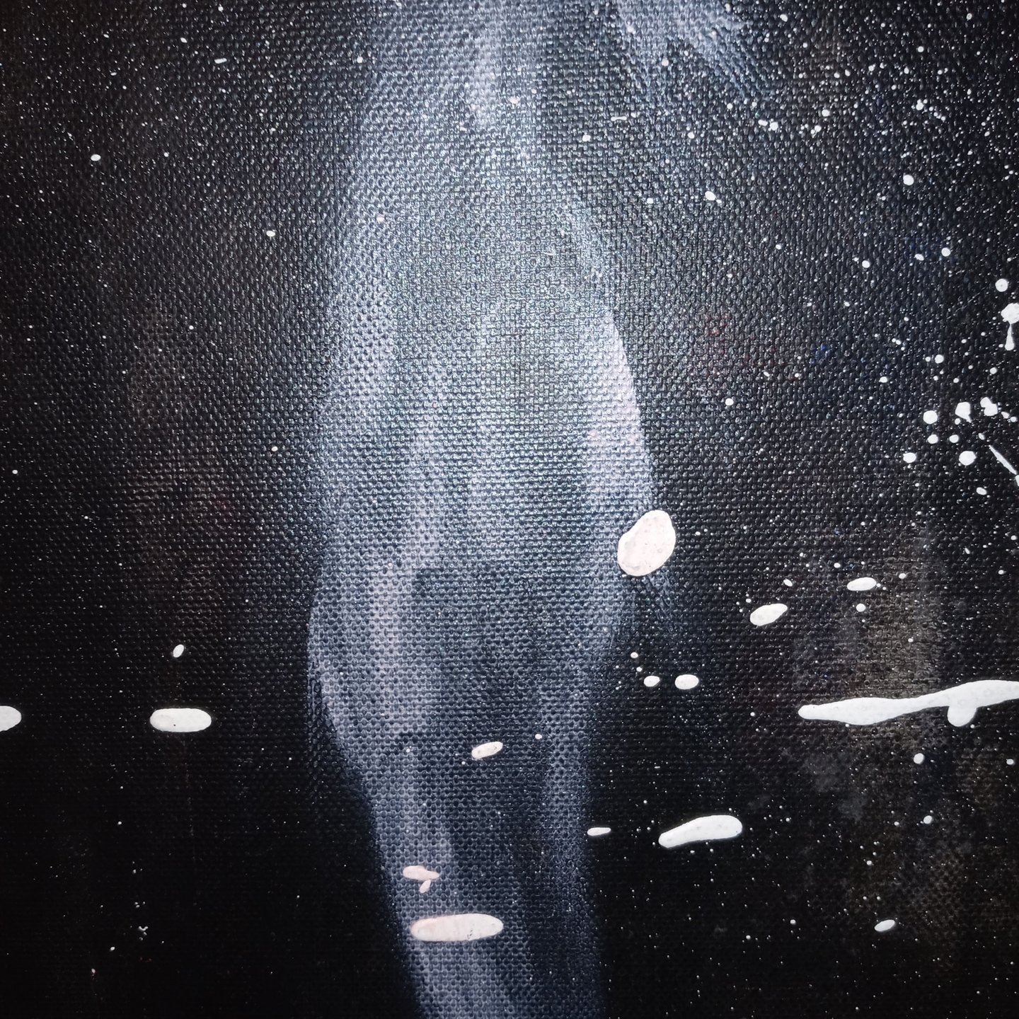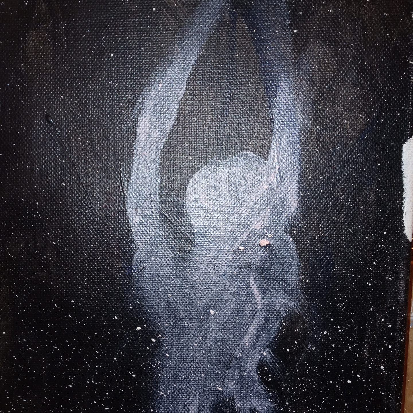 This is a recycled 8″X24″ canvas that was black with the white spatter, while the mermaid is what I saw swimming in the inky darkness, so using finger and paint I started their outline in pink and will continue to start the layering process. They are ascending to the light from the depths, smooth and gliding I’m not sure what color they are, a peacock, a rainbow, or maybe celestial or some combination of all the above.