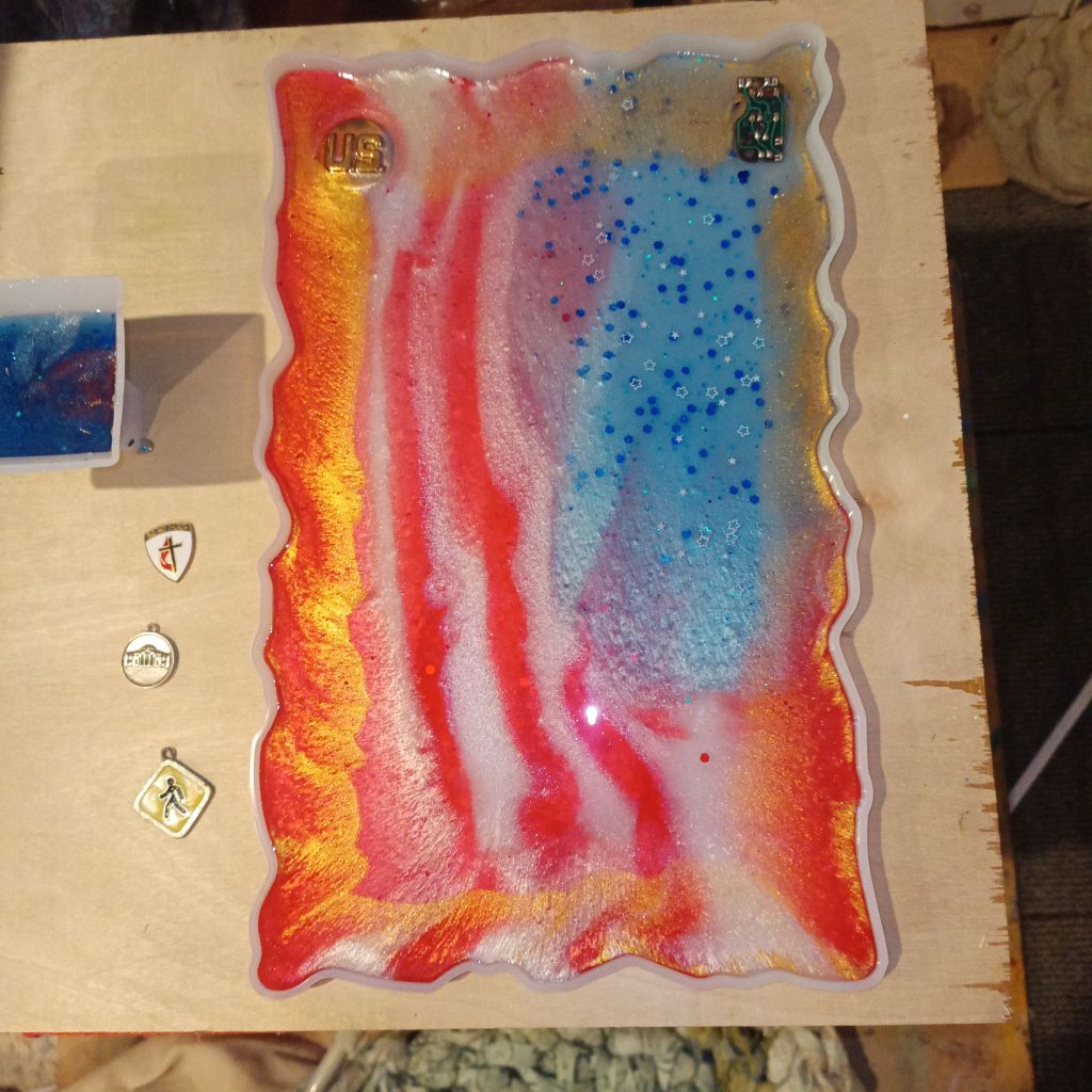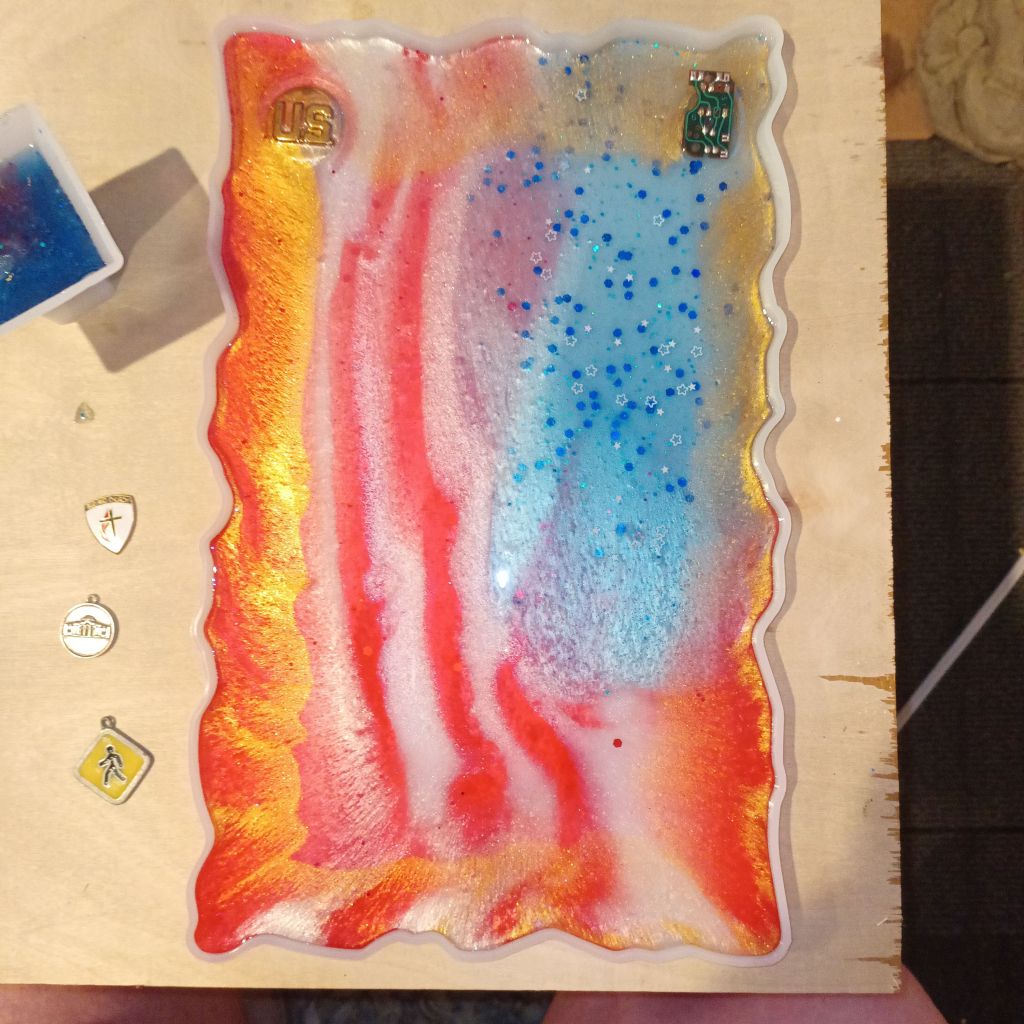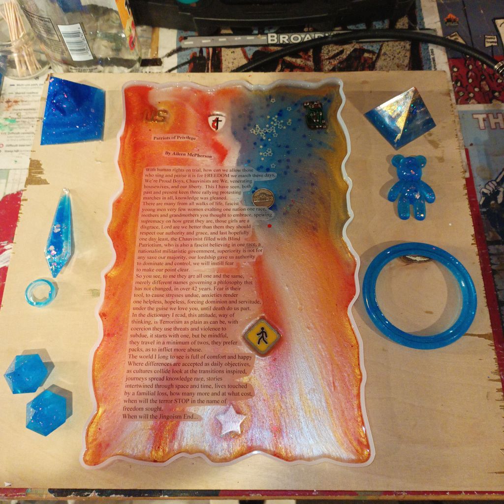 the beginning of the Patriots of privilege Poetry plaque and the completed resin poetry current collection more to come but this is what I have so far And I’ll be collecting the scraps for an abstract resin project in the future.