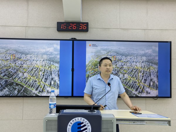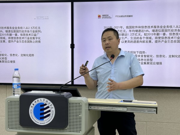 本次讲座由公司党总支书记董亚老师主持,邀请到了西安软件园人才服务与产学合作负责人,西安市招才引智“校园引才特使”陕西省创新创业导师商务部特约讲师——蔡鹏老师。蔡老师主要从西安IT产业实时画像,人才服务与产学合作,IT行业就业形势解析,优秀企业案例集锦四个模块开始讲解。