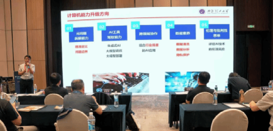 西北工业大学周兴社教授做了题为《生成式Al对计算机专业教育影响》的报告,以生成式AI的模型演进为时间脉络,多维度分析生成式AI及Deepseek对高等教育的影响,并论述了智能时代背景下的计算机类人才培养的建议。