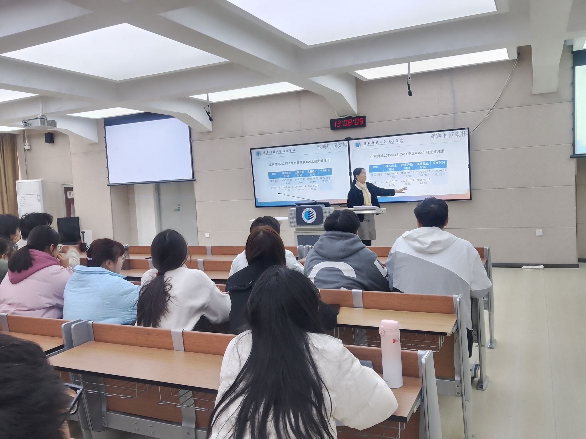 讲座伊始,吕纪荣副经理就美赛的多个方面进行了全面而深入的介绍。她详细阐述了美赛的创立背景、发展历程、主办单位、竞赛时间以及竞赛规则等。并详细分析了备赛过程,强调了论文写作和团队写作的重要性,向同学们分享了实践中常用的模型和赛题类型与选题方向的策略。此外,吕副经理还推荐了一系列学习资源,并强调了竞赛中需要注意的事项。她还特别对比了美赛与国赛的区别,以及美赛的评审标准,使同学们对美赛有了更加清晰的认识。