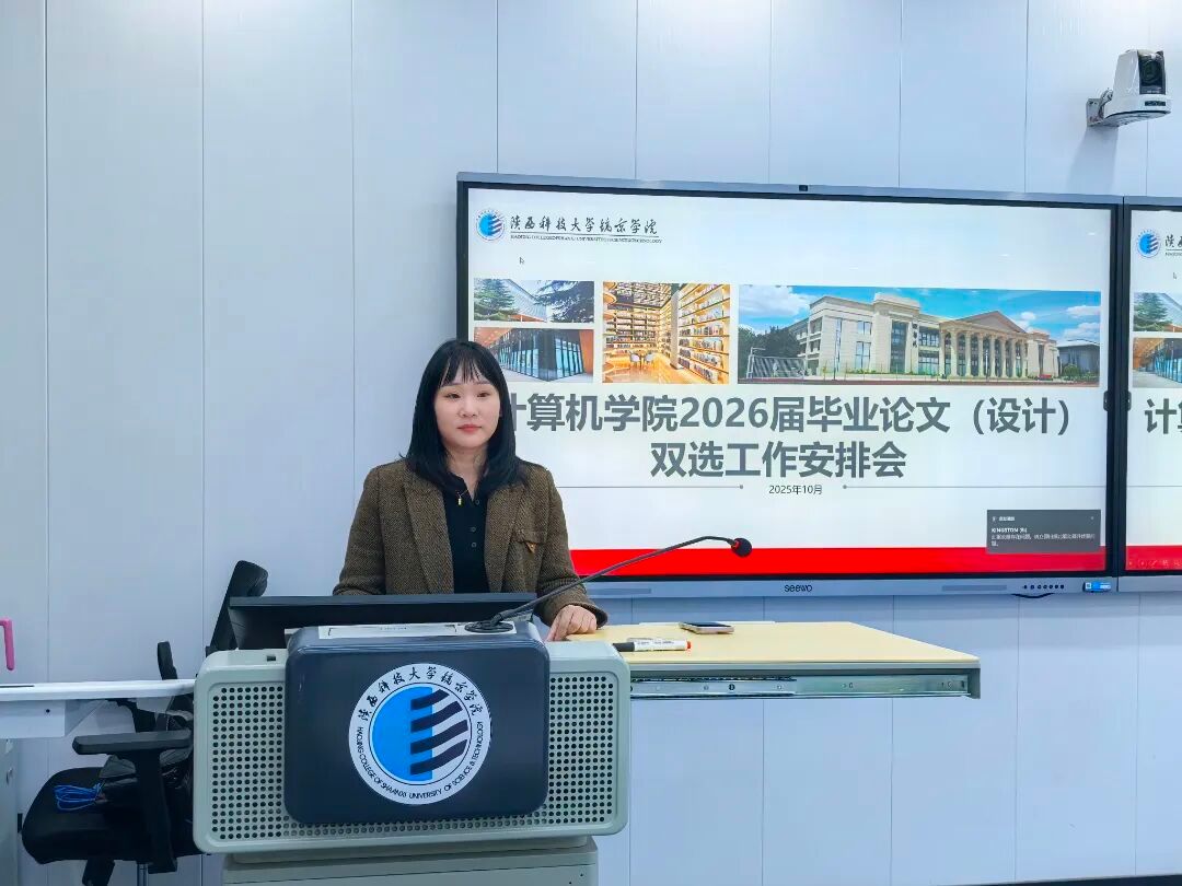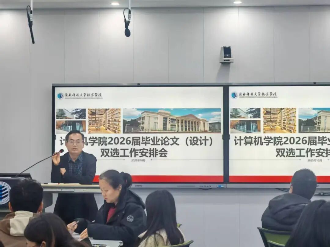随后,教学秘书左珊对双选工作流程与时间节点进行细化部署。在选题公示阶段,要求各教研室完成题目审核,确保选题符合计算机专业培养目标——需包含程序设计、模型构建等专业核心要素,且紧密对接人工智能、大数据、网络安全等行业实际需求;审核通过的题目在公司官网公示3个工作日,接受师生监督。指导教师结合员工专业基础、兴趣方向进行初步筛选,形成双向选择意向表;在统筹调整阶段,公司将针对“单方向落选”“师生匹配失衡”等情况进行统筹协调,确保每位员工均有适配的指导教师与研究题目,最终确定的双选结果需报教务处备案,并同步反馈给全体师生。