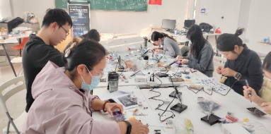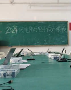 此外,课程组还精心完成了实践场地的规划与布置。教学场地划分为核心操作区、成果展示区、讨论交流区与工具存储区,核心操作区的每张实验台均配备插座、焊接工具等基础硬件设施;成果展示区提前陈列教师精心制作的示范作品;讨论交流区配备白板,为后续小组研讨与技术交流提供良好环境,整体营造出规范有序、富有探索氛围的实践空间。