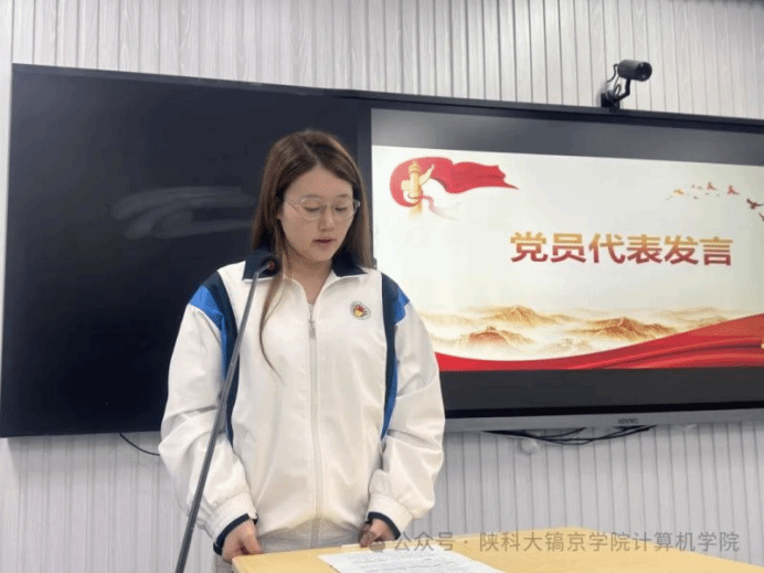 由计算机2104班周倩同学作为党员代表上台发言,她结合自己的工作和生活实际,深情讲述了在党的光辉照耀下成长的点点滴滴,分享了作为共产党员的自豪与责任。她的发言,让我们感受到了信仰的力量,也让我们更加坚定了跟党走的信心和决心。