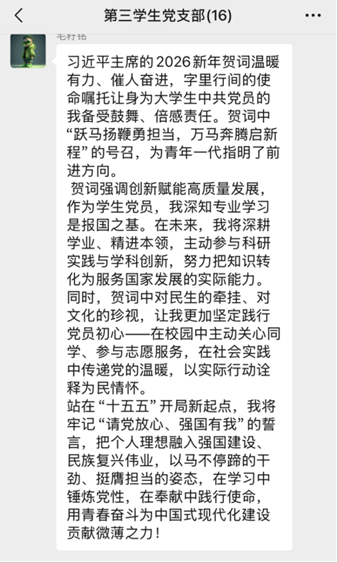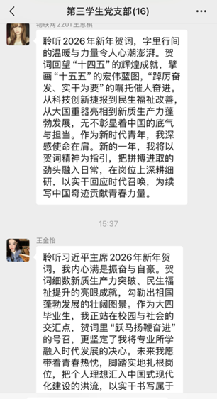 考虑到大四党员实习在外的实际情况,支部提前搭建线上学习平台,确保实习党员“不掉队”、学习“不缺位”。线上大四党员同步观看贺词后,通过支部微信群积极分享学习感悟,与线下师生实时互动交流,畅谈对贺词中科技创新、青年担当等内容的理解,形成“线上+线下”同频共振、全域覆盖的学习氛围。