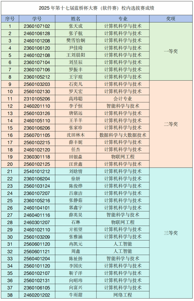 本次校赛采用蓝桥杯官方校内赛系统,采取蓝桥杯官方OI赛制进行评分,经系统排名,校赛成绩现已公布——本次共有38名同学获得奖项,并将同步晋级省赛。